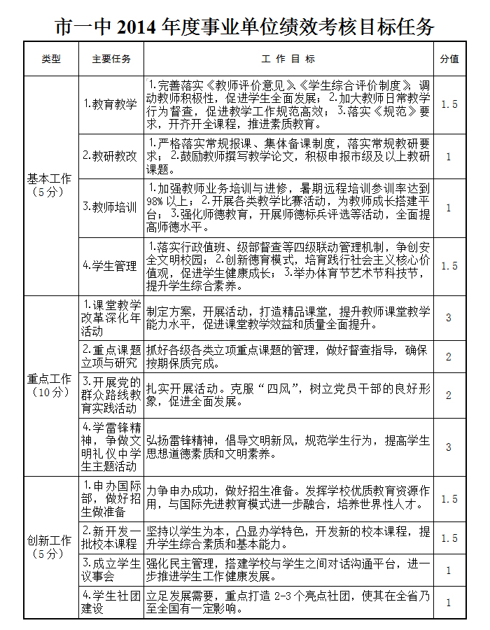 2014年事业单位绩效考核目标任务