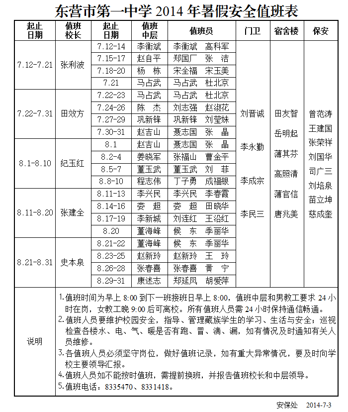 东营市第一中学2014年暑假安全值班表