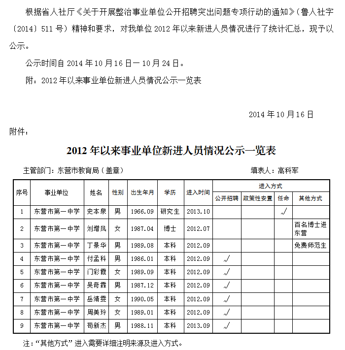 东营市第一中学2012年以来增加编内人员情况公示