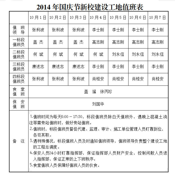2014年国庆节新校建设工地值班表
