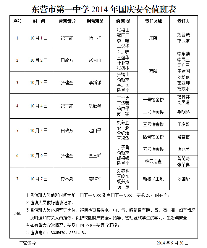 东营市第一中学2014年国庆安全值班表
