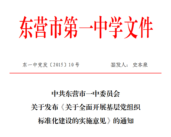 根据市委组织部《关于全面开展基层党组织标准化建设的实施意见》和市教育局文件及有关会议精神,经学校党委研究,特制定中共东营市一中委员会《关于全面开展基层党组织标准化建设的实施意见》,请各党支部结合工作实际,认真抓好贯彻落实。