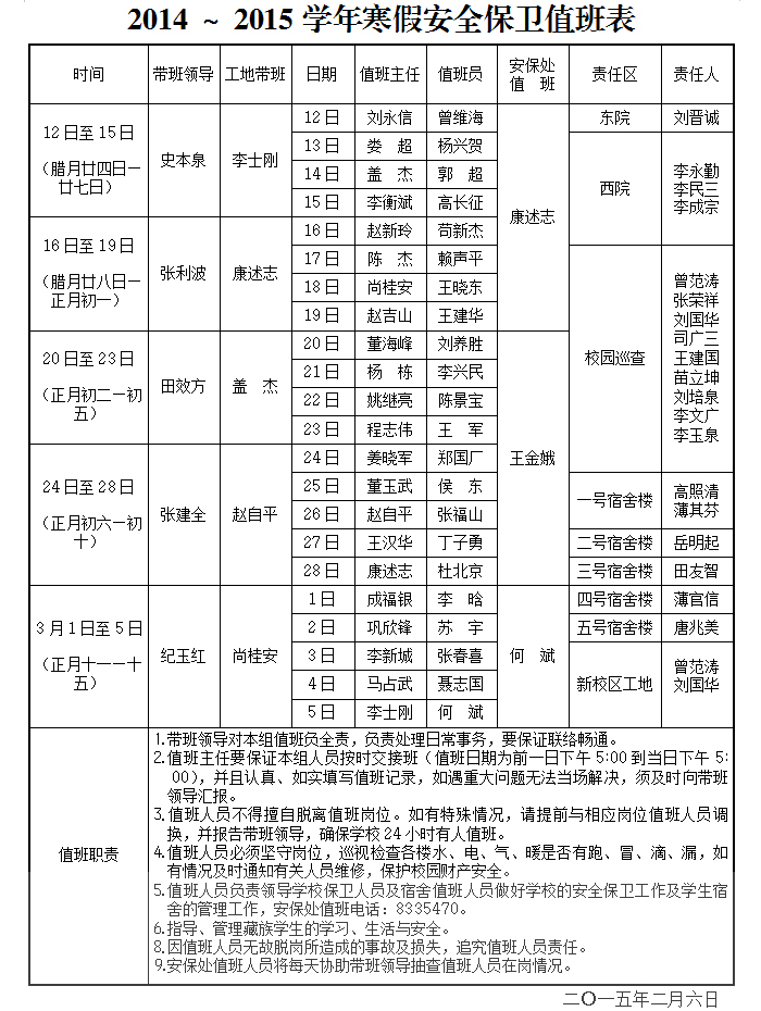 2014~2015学年寒假安全保卫值班表