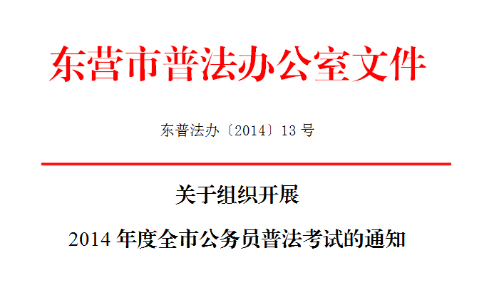 为深入贯彻落实党的十八届四中全会关于推进依法治国若干重大问题的决定精神,推进法治东营建设,不断提高全市公务员队伍依法决策、依法行政、依法管理的能力和水平,在前期准备工作基础上,定于近期组织开展2014年度全市法律知识考试,现将有关事项通知如下: