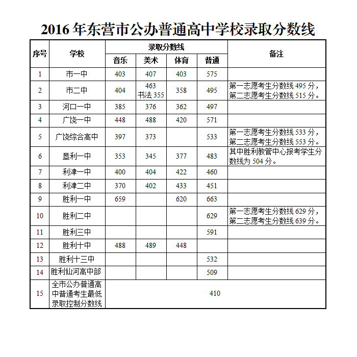 2016年东营市公办普通高中学校录取分数线