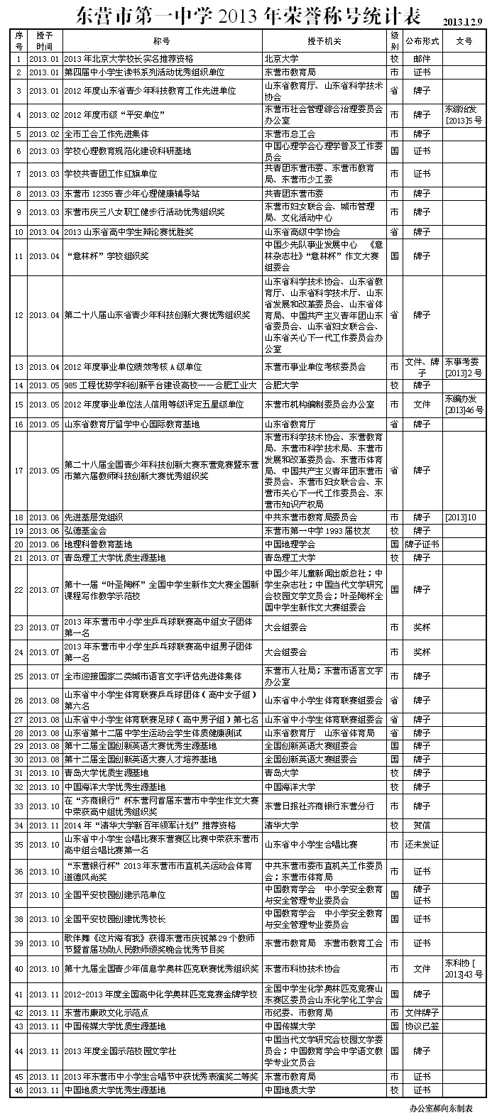 2013年学校荣誉一览表