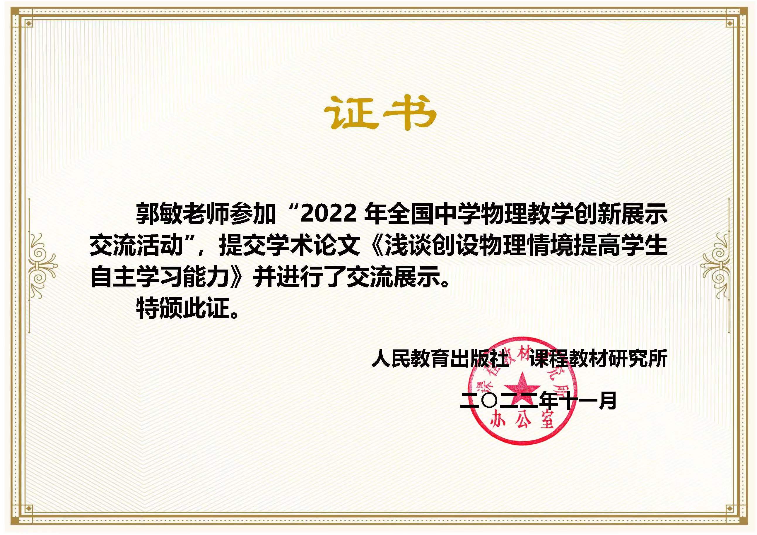 工作室成员郭敏老师代表山东省参加此次比赛,与来自全国各省(自治区、直辖市)的优秀物理教师分享了《浅谈创设物理情景提高学生学习能力》论文,得到与会专家的一致好评。