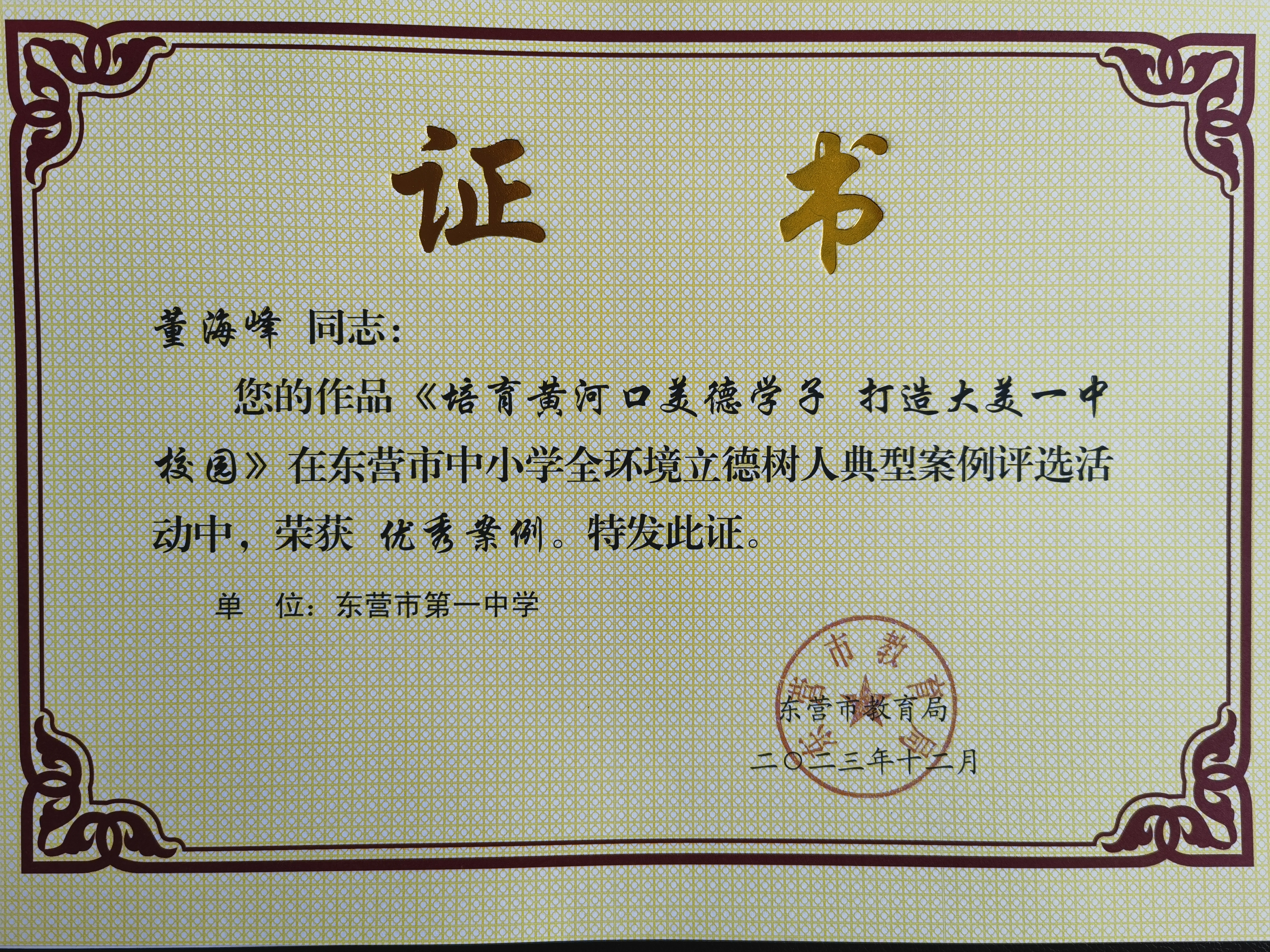 董海峰在东营市中小学全环境立德树人典型案例评选活动中荣获优秀案例