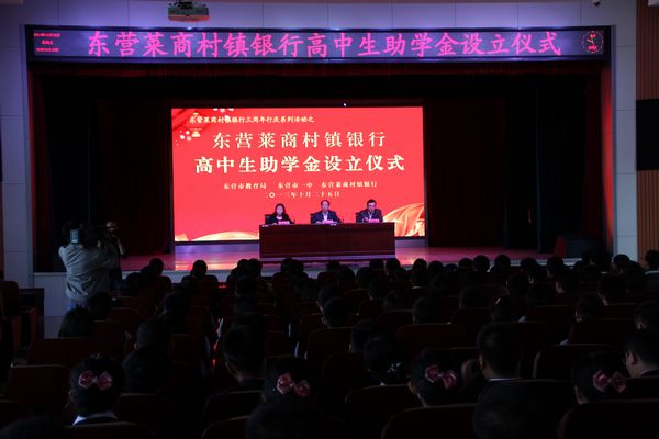 东营市莱商村镇银行是东营首家村镇银行,在支持全市经济发展的同时,一直不忘承担社会责任,致力于各项社会公益事业。在今天的助学金设立仪式上,东营莱商村镇银行向我校捐款30万元,用于资助150名生活贫困、品学兼优的同学。