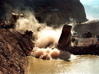 10月28日上午10时28分,八车石料向狭窄的围堰龙口倾泻而下,黄河小浪底水利枢纽工程截流成功。