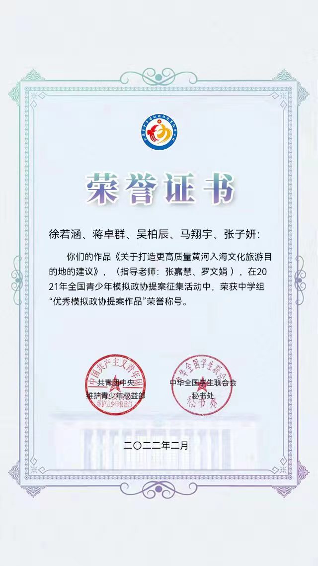 张嘉慧指导学生参加全国青少年模拟政协提案,获全国优秀提案。