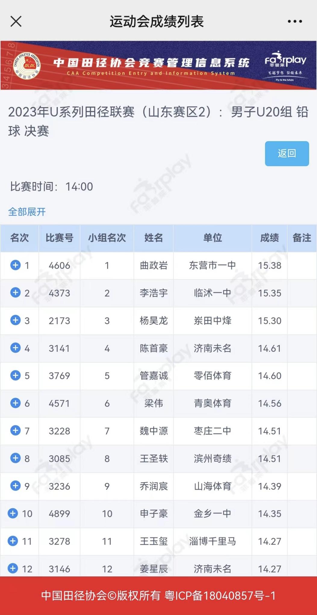 在11月7—9号的山东省U系列田径比赛中,我校田径队曲政岩获得男子铅球第一名,该成绩打破了市纪录和校记录。白同禹获得男子跳高第二名。两项成绩和名次再次打破我校该项在省中学生比赛中的最好记录。
