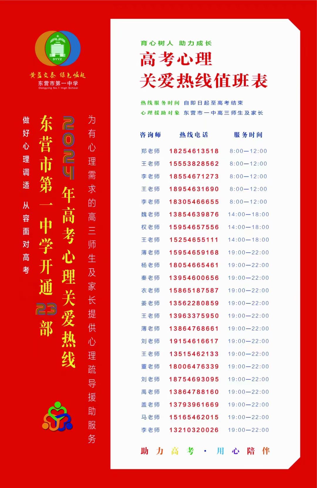为帮助高三师生和家长做好心理调适,从容面对高考,东营市一中开通了23部2024年高考心理关爱热线,为有心理需求的高三师生及家长提供心理疏导援助服务。
