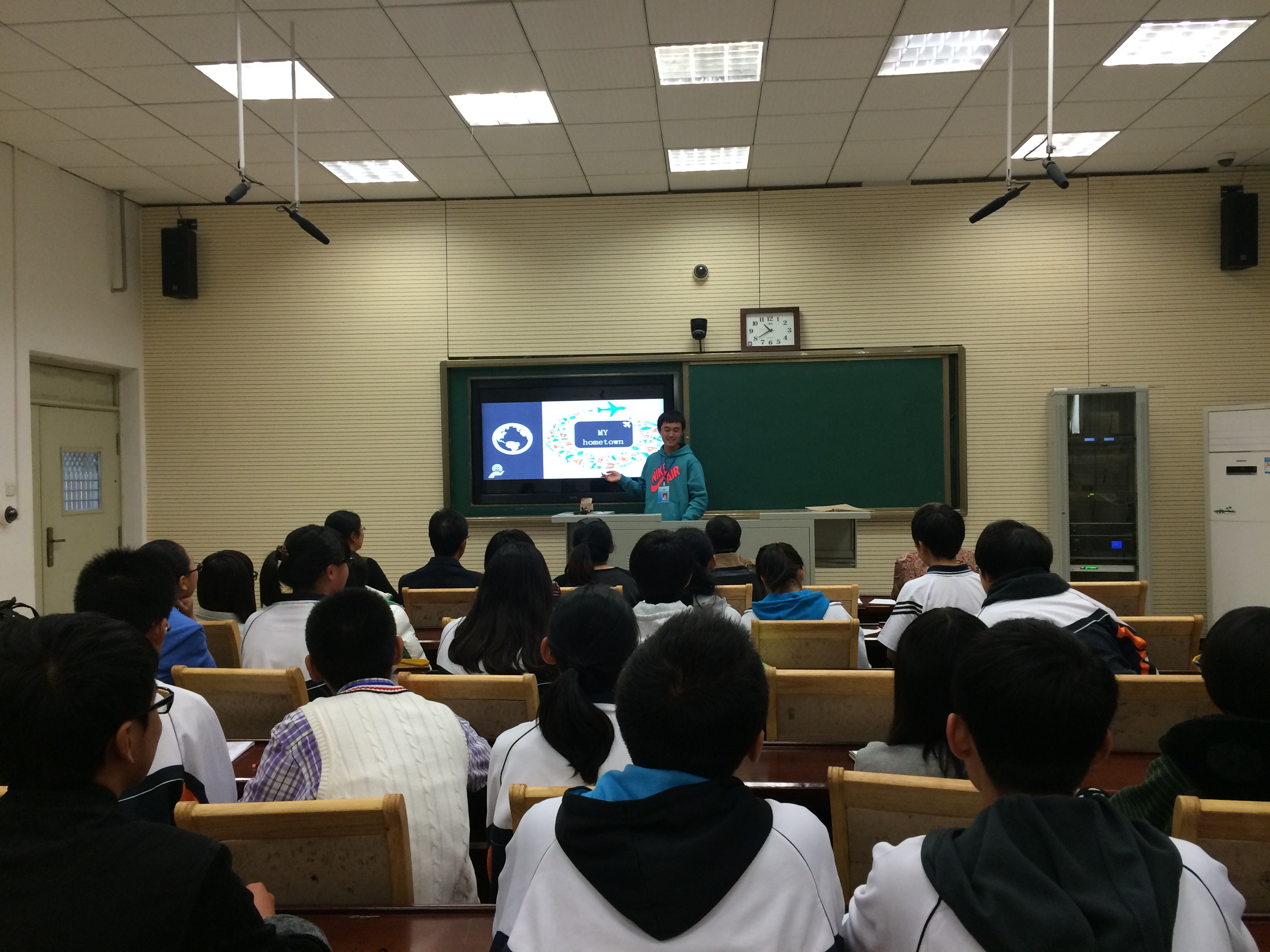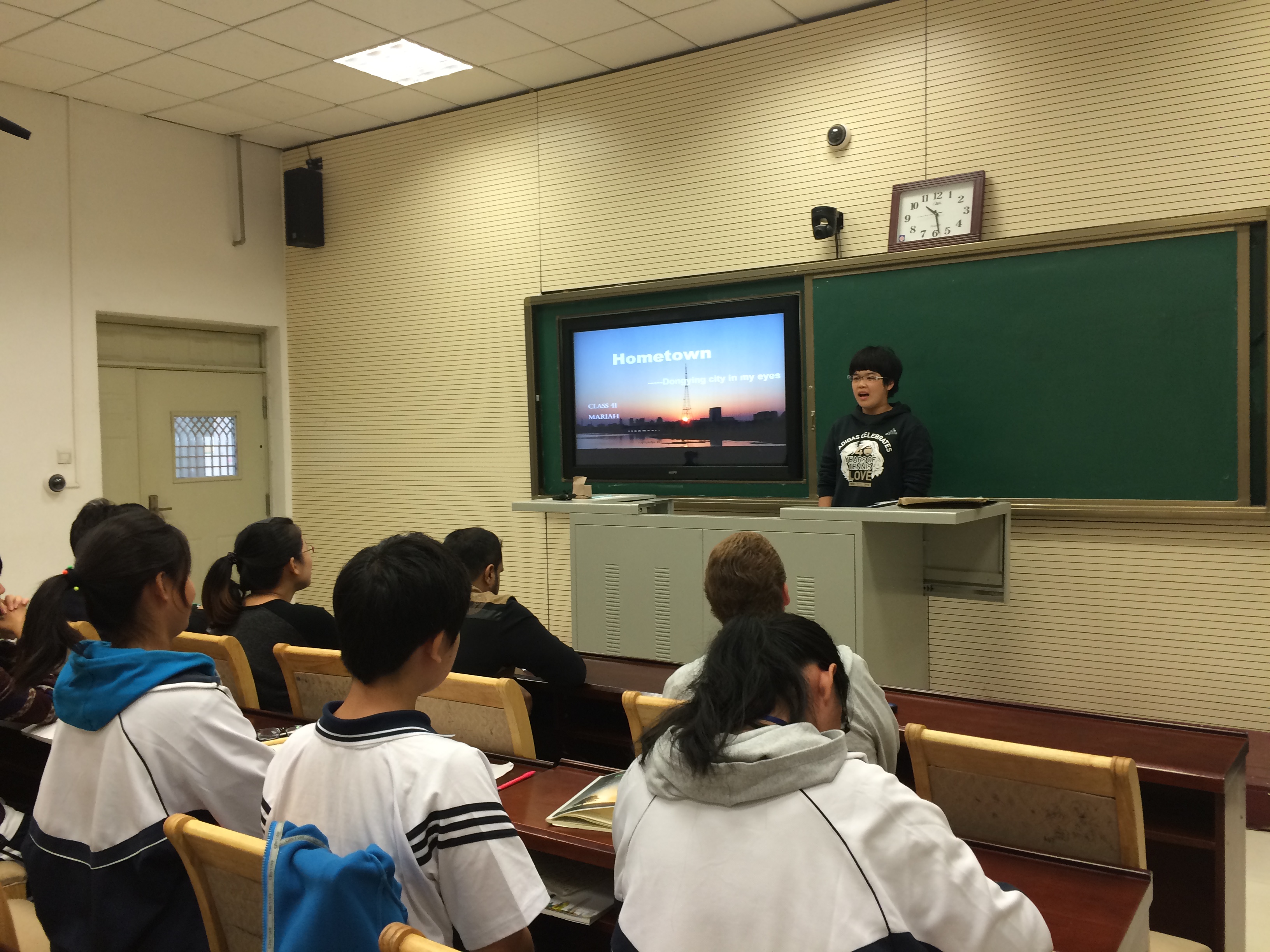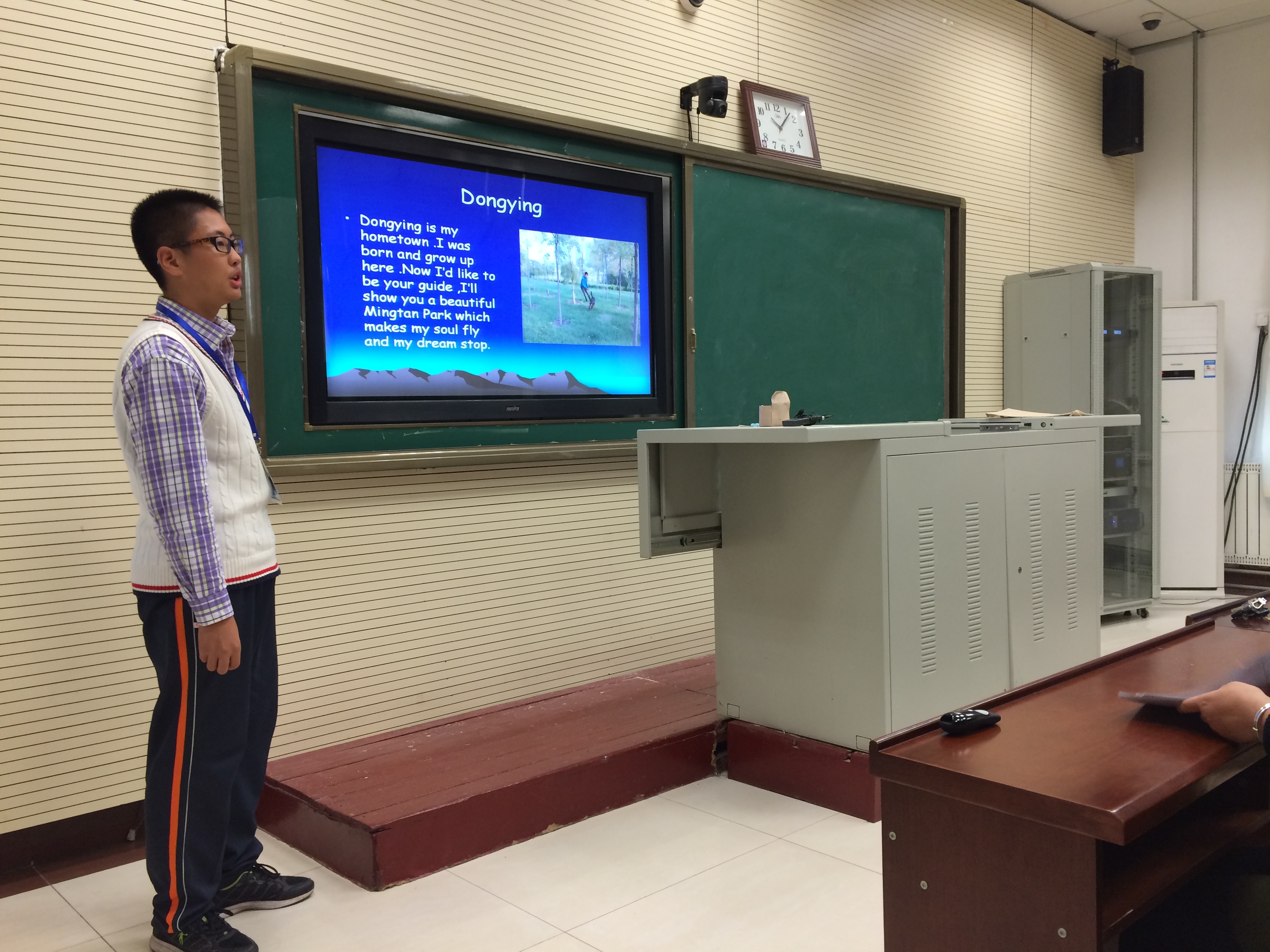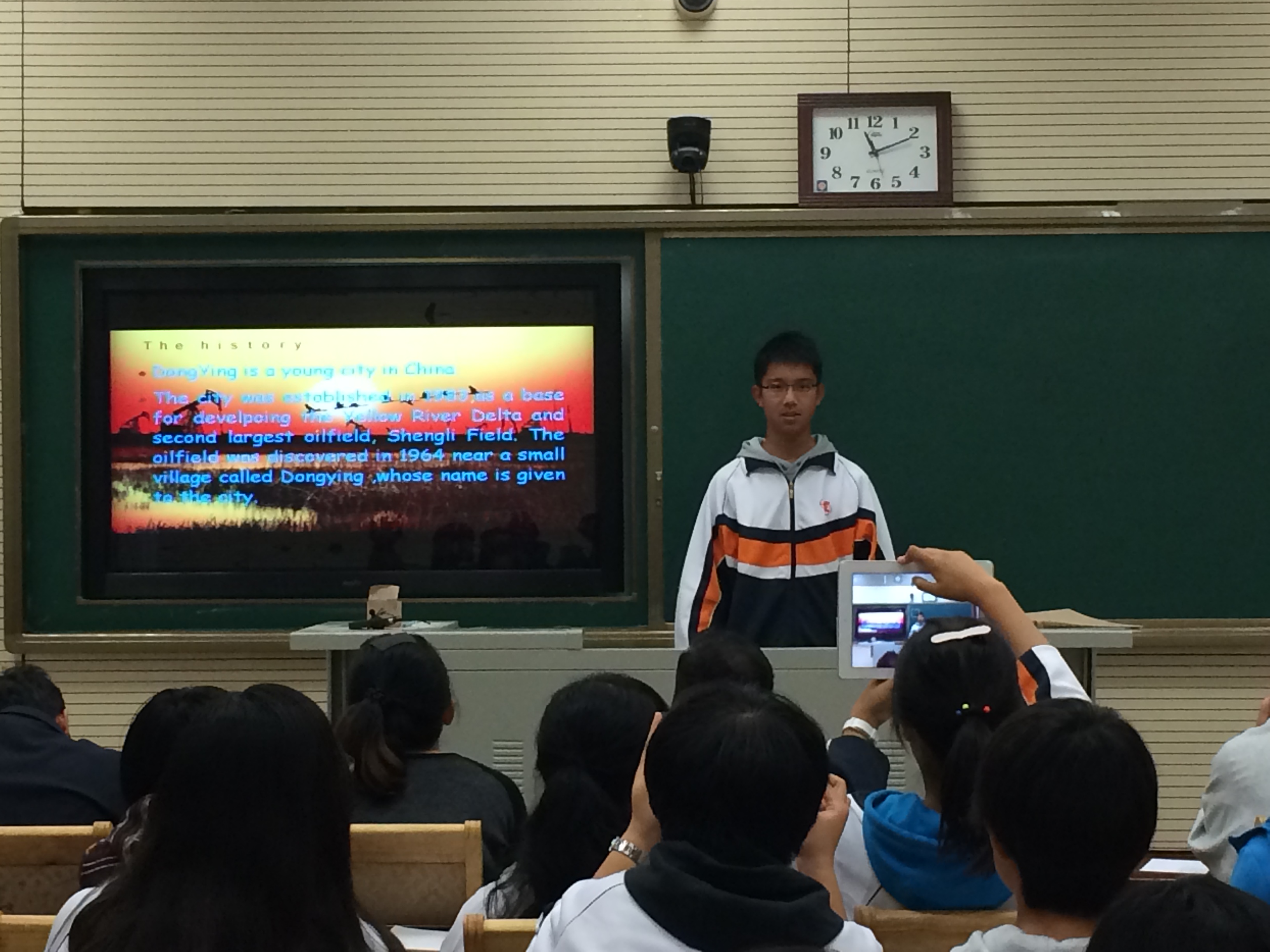 10月14日上午我校国际班学生三楼多媒体教室,举行了第三期英语角----我给外教当导游,国际班的同学利用英语给外教Mani 和 Leslie 介绍我们美丽的家乡东营。精美的幻灯片制作,缜密的逻辑思维,流利的口语讲解,倍受所有到场的老师赞赏。市一中国际部注重孩子们个性的发展和培养,采取西方高校盛行的“导师制”培养模式,定期开展丰富多彩的活动。学生入校一个月以来,学习的兴趣倍增。学生实现了从拘谨的听讲者到挥洒自如的授课者的转变。你可能会被里面精彩的教学所吸引。