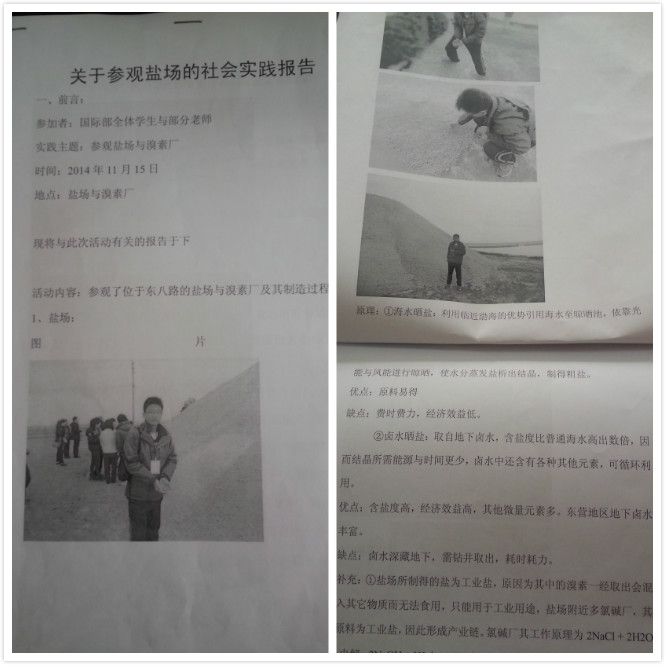此次活动的目的地是东八路的盐场,同学们在盐场宋经理的带领下,首先参观了晒盐池,了解了抽取地下卤水晒盐析盐的过程,接着又参观了溴素厂,学习了如何利用氧化还原反应中的置换反应置换出海水中的溴单质。此外,宋经理还给大家介绍了渤海地区的盐储存量、晒盐条件及概况。此次盐场之行,同学们收获颇多,不仅对盐文化有了进一步的认识,也加深了学生对家乡的了解。