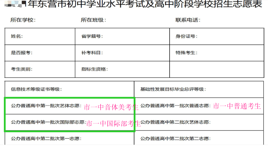 1、学生填报志愿时,在志愿表中填报东营市一中国际部或者艺体志愿。