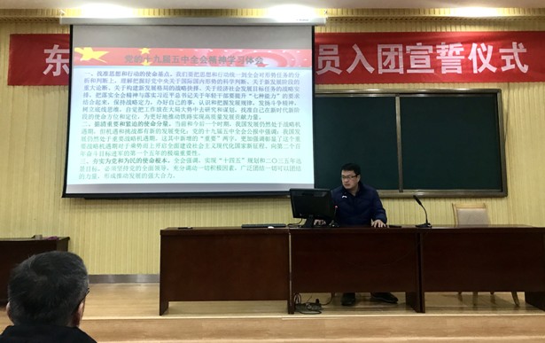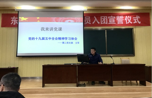10月26日,党的十九届五中全会召开以来,第二党支部的全体党员教师就一直高度关注会议的最新动态,通过央视等主流媒体、学习强国等学习平台,认真学习,深刻领会十九届五中全会精神,所属四个党小组提前谋划,先是安排党员自学,然后利用主题党日的时间,再集中学习十九届五中全会的相关内容。集中学习时,支部副书记王军同志做了关于十九届五中全会的学习心得专题报告。