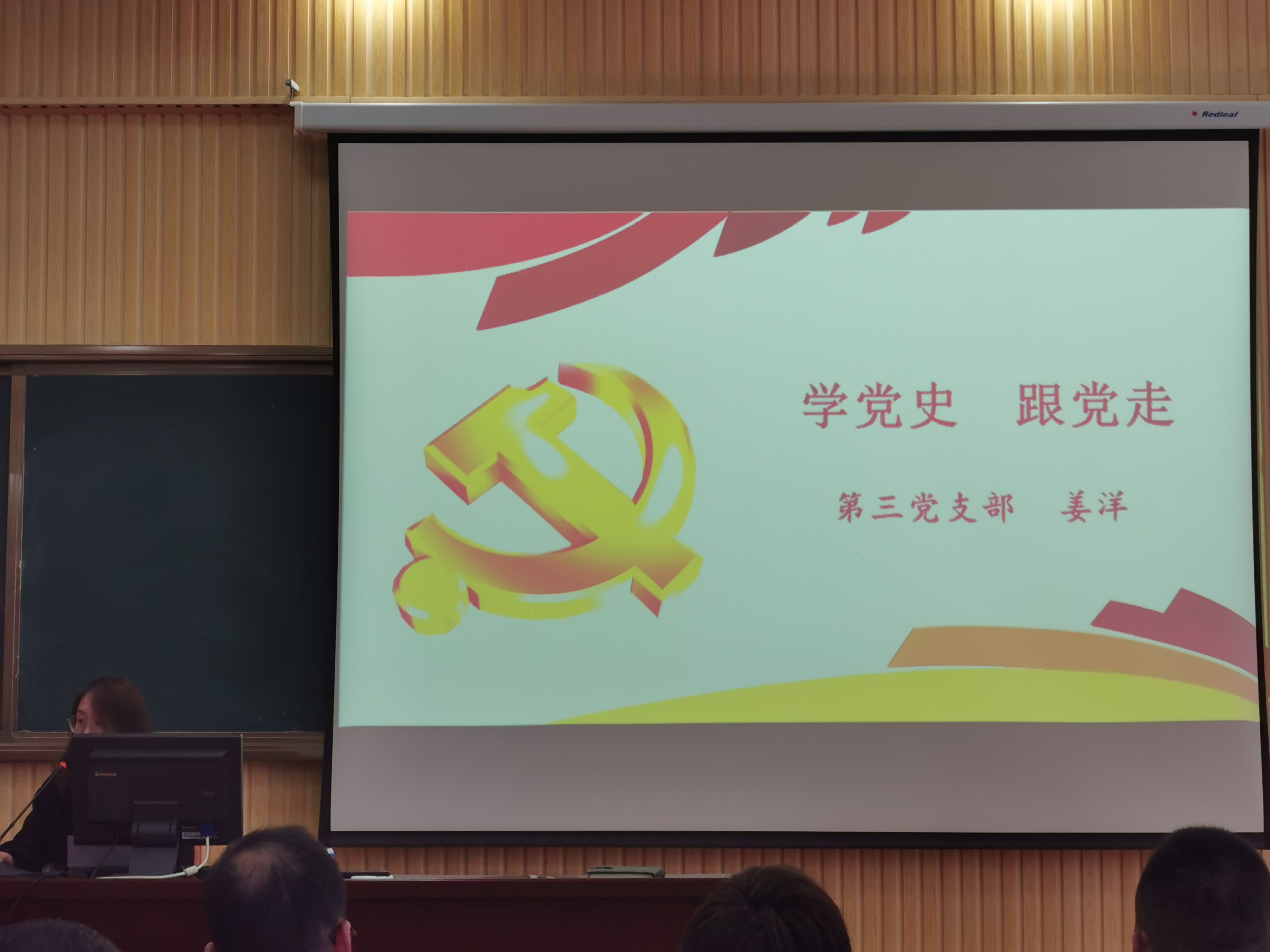 首先,姜洋老师发表题为“学党史,跟党走”的演说,为大家讲述了东营优秀共产党员的典型事例。姜洋老师激情澎湃的讲解以及各位优秀党员对党忠心,对群众全心全意的实例令在座的各位党员动容。
