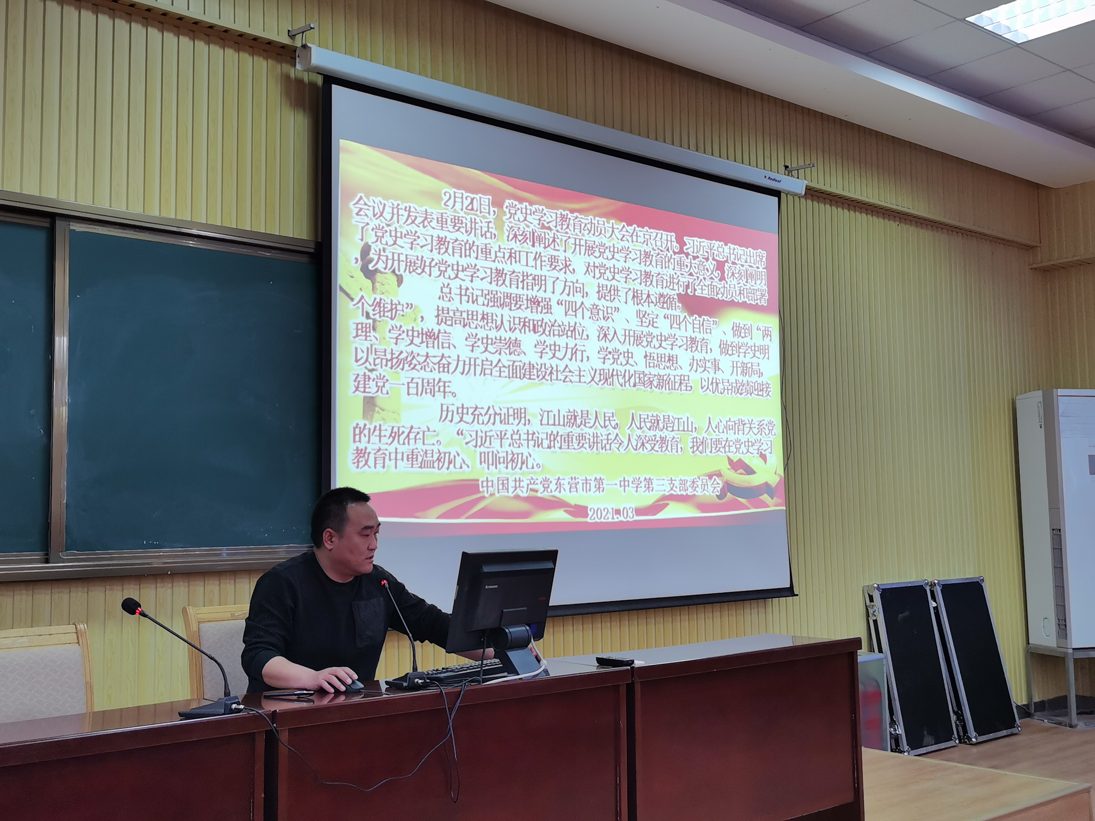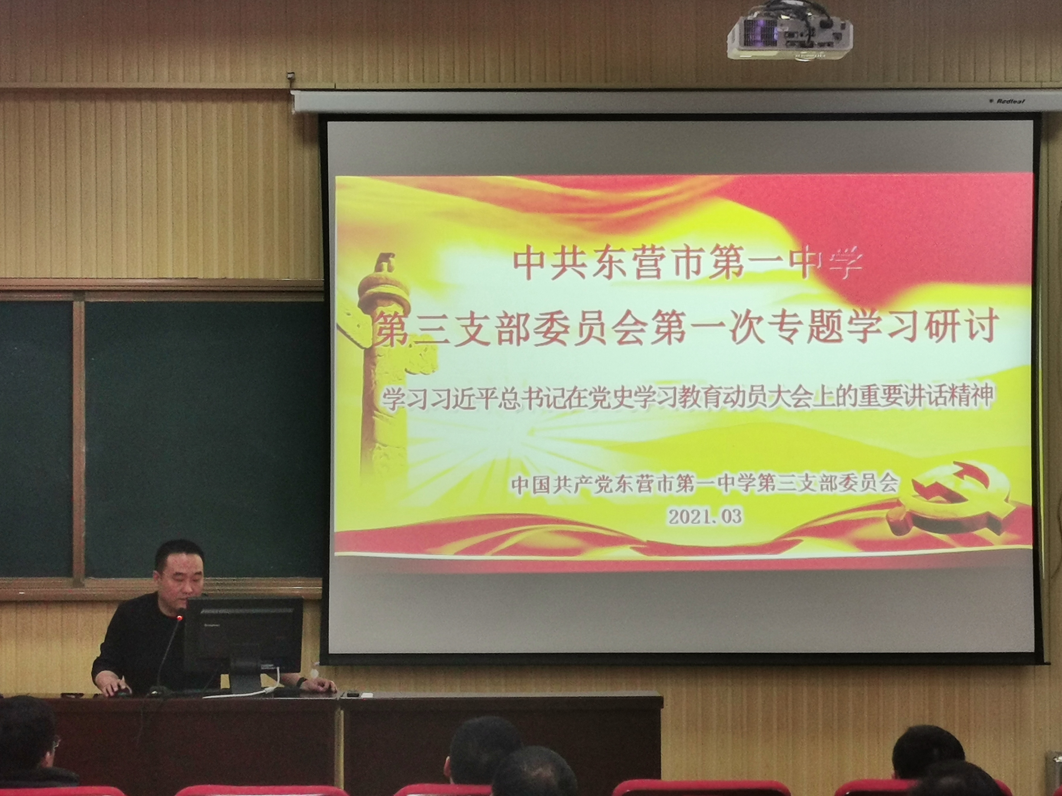 为扎实推进党史学习教育,根据市委教育工委工作安排,按照学校党史学习教育计划,东营市一中第三党支部2021年4月2日上午在2019级阶梯教室组织第一次学习研讨。本次研讨有李中刚主持,研讨内容学习习习近平总书记在全国党史学习教育动员大会上的重要讲话精神。