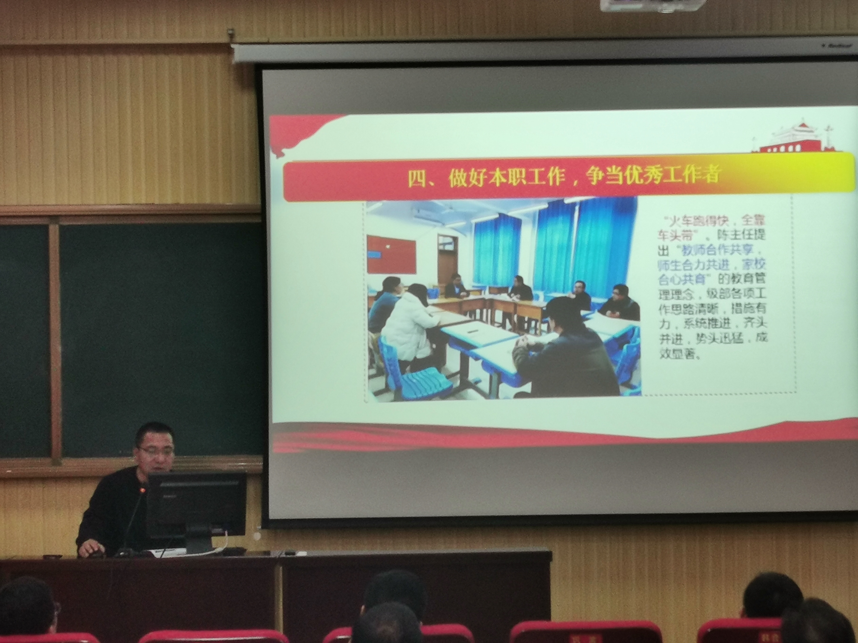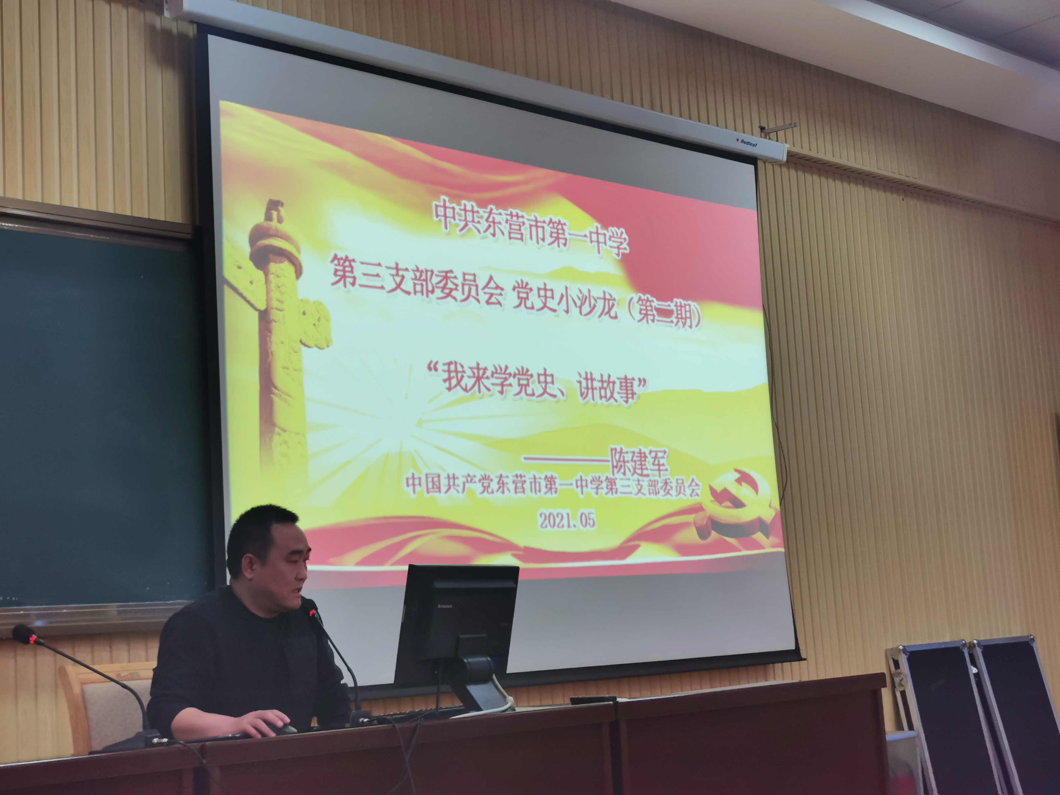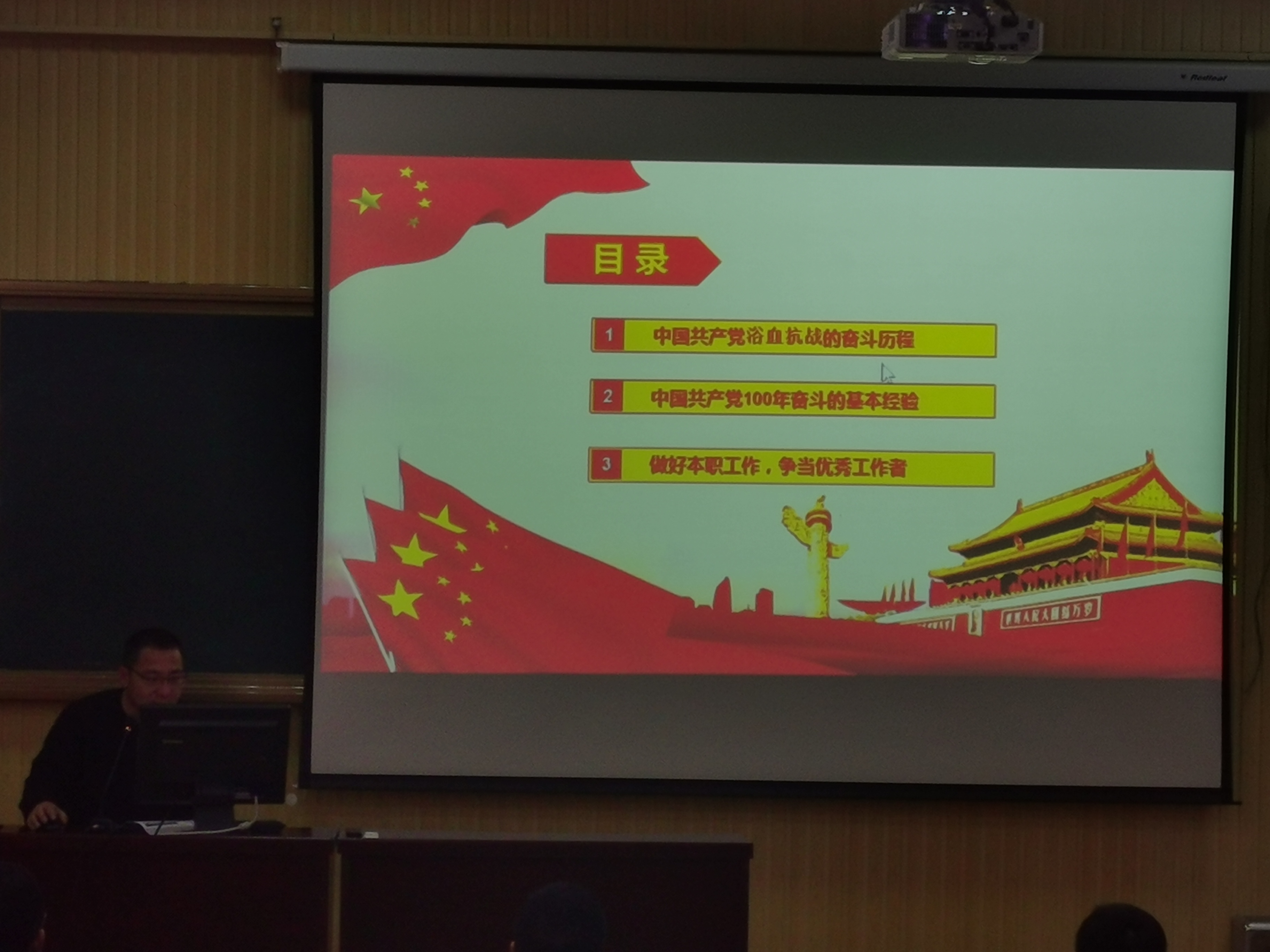 陈建军老师发表题为“我开学党史,讲故事”的演说。讲述内容主要包括三方面:中国共产党浴血抗战的奋斗历程、中国共产党100年奋斗的基本经验和做好本职工作,争当优秀工作者三方面。