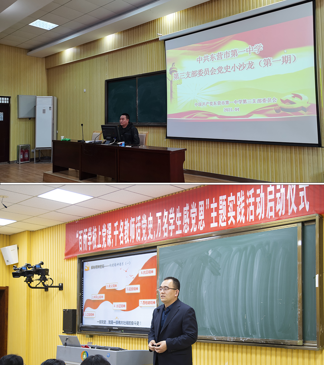 二是,红色课堂让党史学习教育“更鲜活”。抓实“永远跟党走”群众性主题宣传教育活动,重点探索了党史学习教育校本化路径,创新开展了“黄河入海——红色文化校本体验”活动,总计16个专题,开展清明节祭英烈、青春颂党成人礼、红心向党远足踏春等仪式;严格落实《“知史爱党·知史爱国”学习展示活动的通知》,依托历史学科优势,筹建“四史”知识资源库,编印《东营市一中2021年高考备考:中共党史的发展》,整理出《2016年以来高考中的党史》,实现了党史学习与一线教研备考的有机结合。