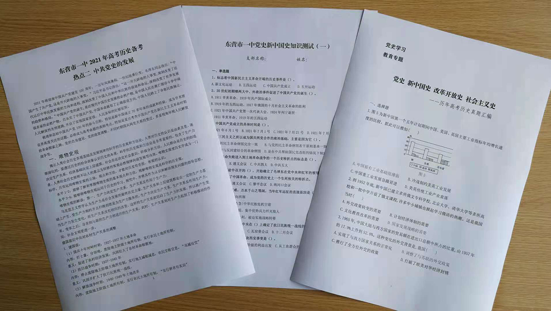 为深化党史学习教育走进学校,扎实推进“永远跟党走”群众主题宣传教育活动与教育教学的有机结合,东营市一中立足学科教研备考,探寻落实的校本路径,做到最紧密的融合。学校组织历史学科教师编印了《东营市一中2021年高考备考:中共党史的发展》,整理出《东营市一中党史新中国史知识测试(一)》、《2016年以来高考中的党史》等校本学案,实现了党史学习与一线教研备考的有机结合。