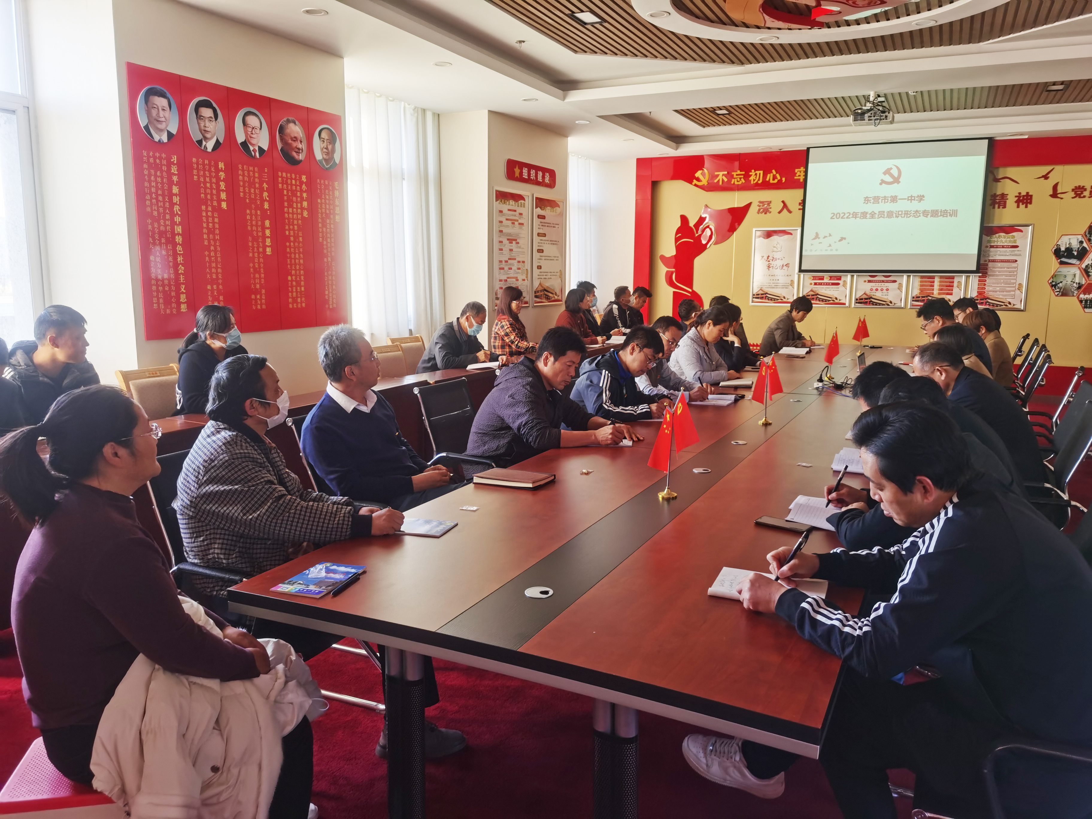 会上,李衡斌同志领学了《东营市第一中学2022年度全员意识形态专题培训》课件,共分四部分内容展开:
