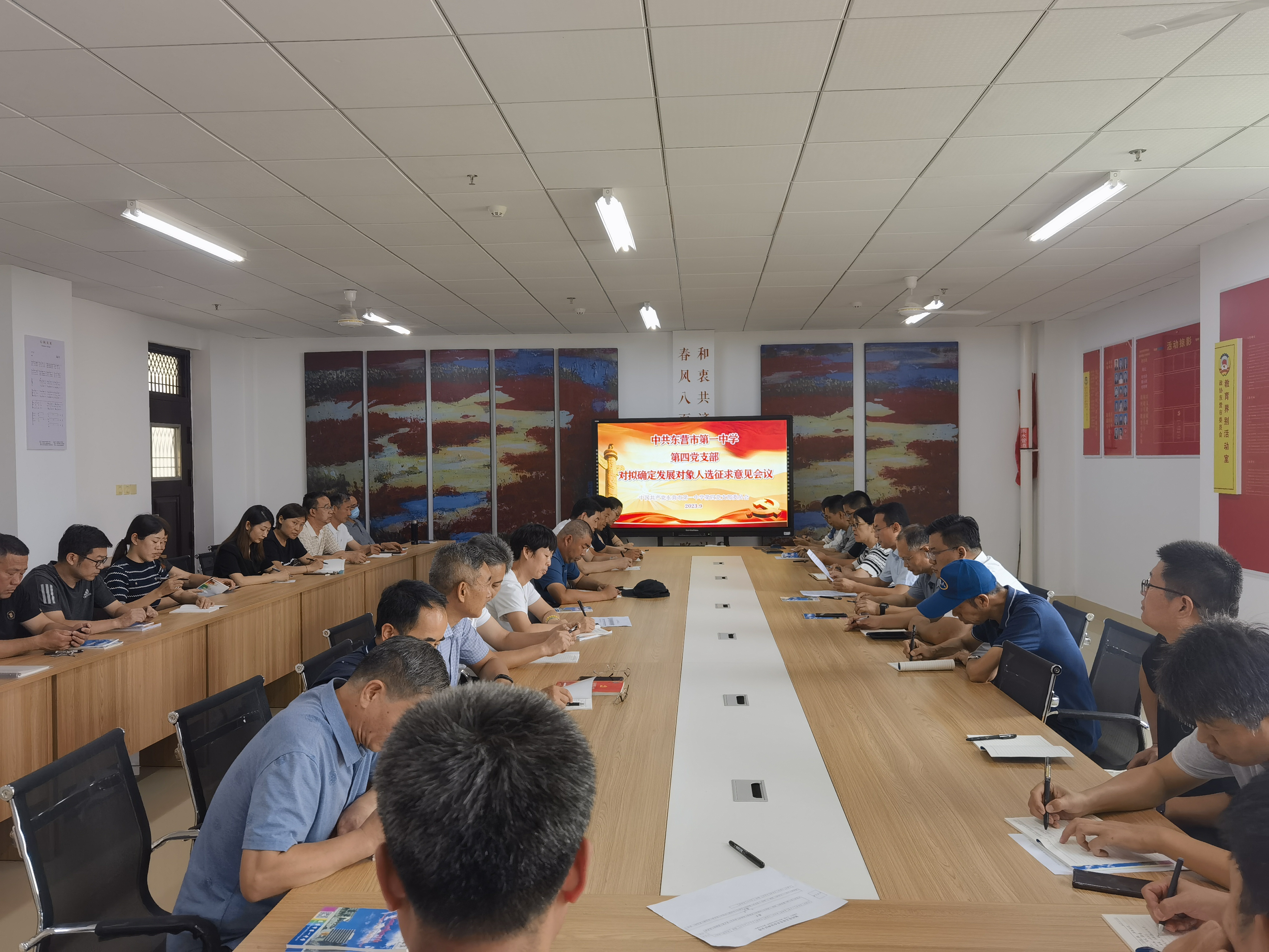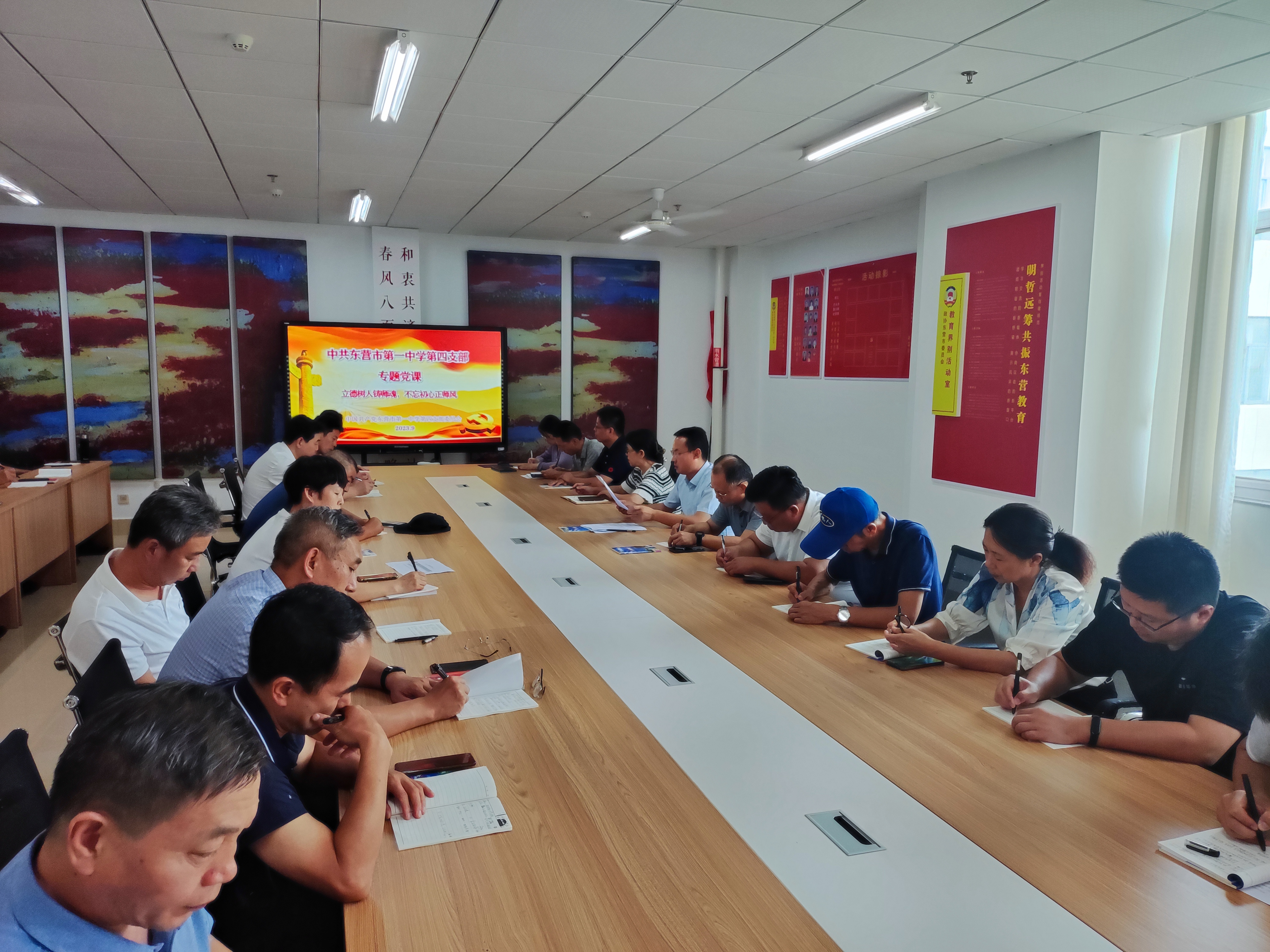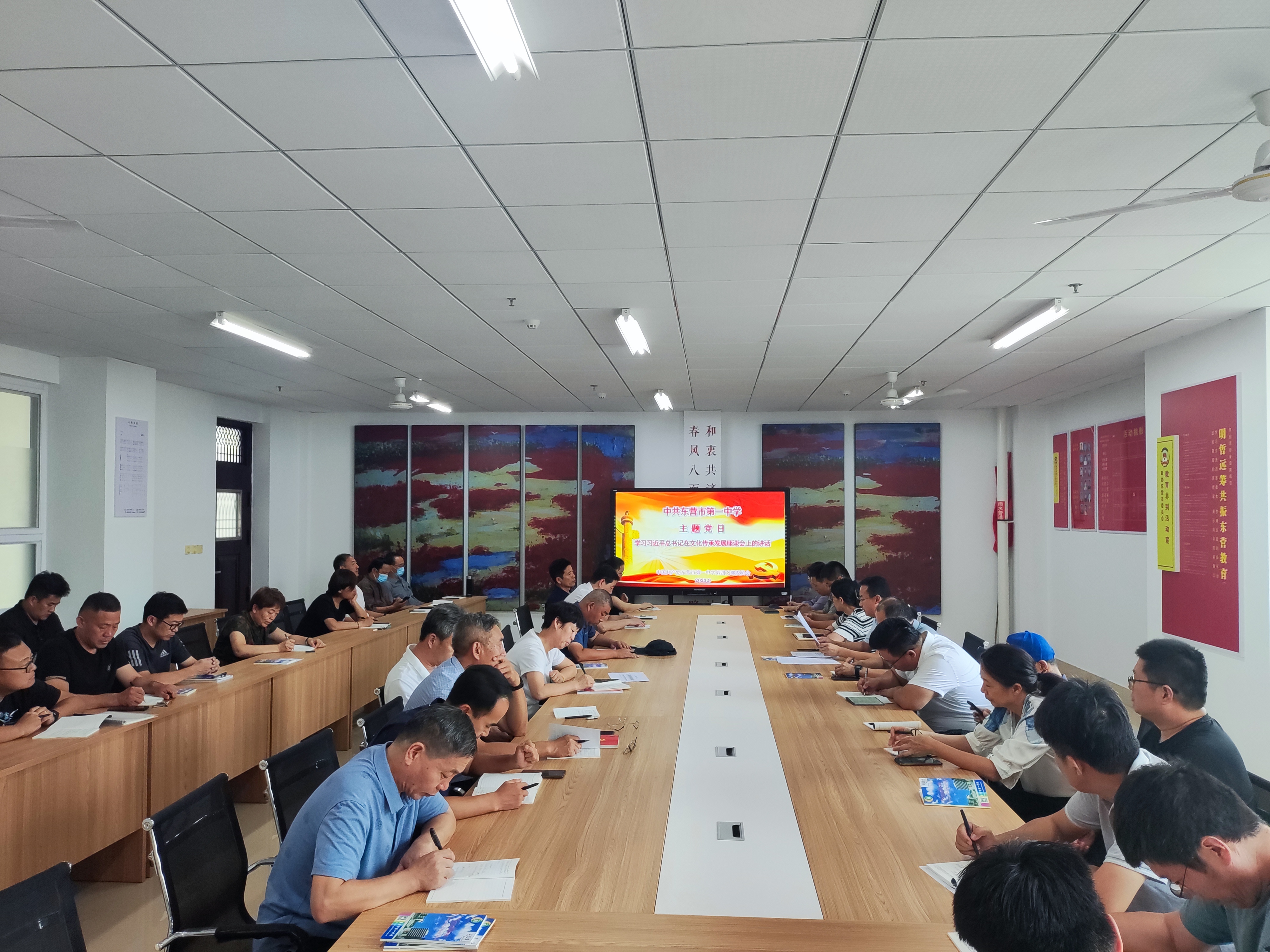 在第二阶段的会议中,支部书记董海峰同志围绕“赓续历史文脉,谱写当代华章”进行了主题发言,并就学习习近平总书记在文化传承发展座谈会上的讲话分享了自己的学习心得。随后,何斌同志带领各位党员共同学习了中共东营市委教育工作委员会《关于严明教师节、中秋节、国庆节期间相关纪律要求的通知》。