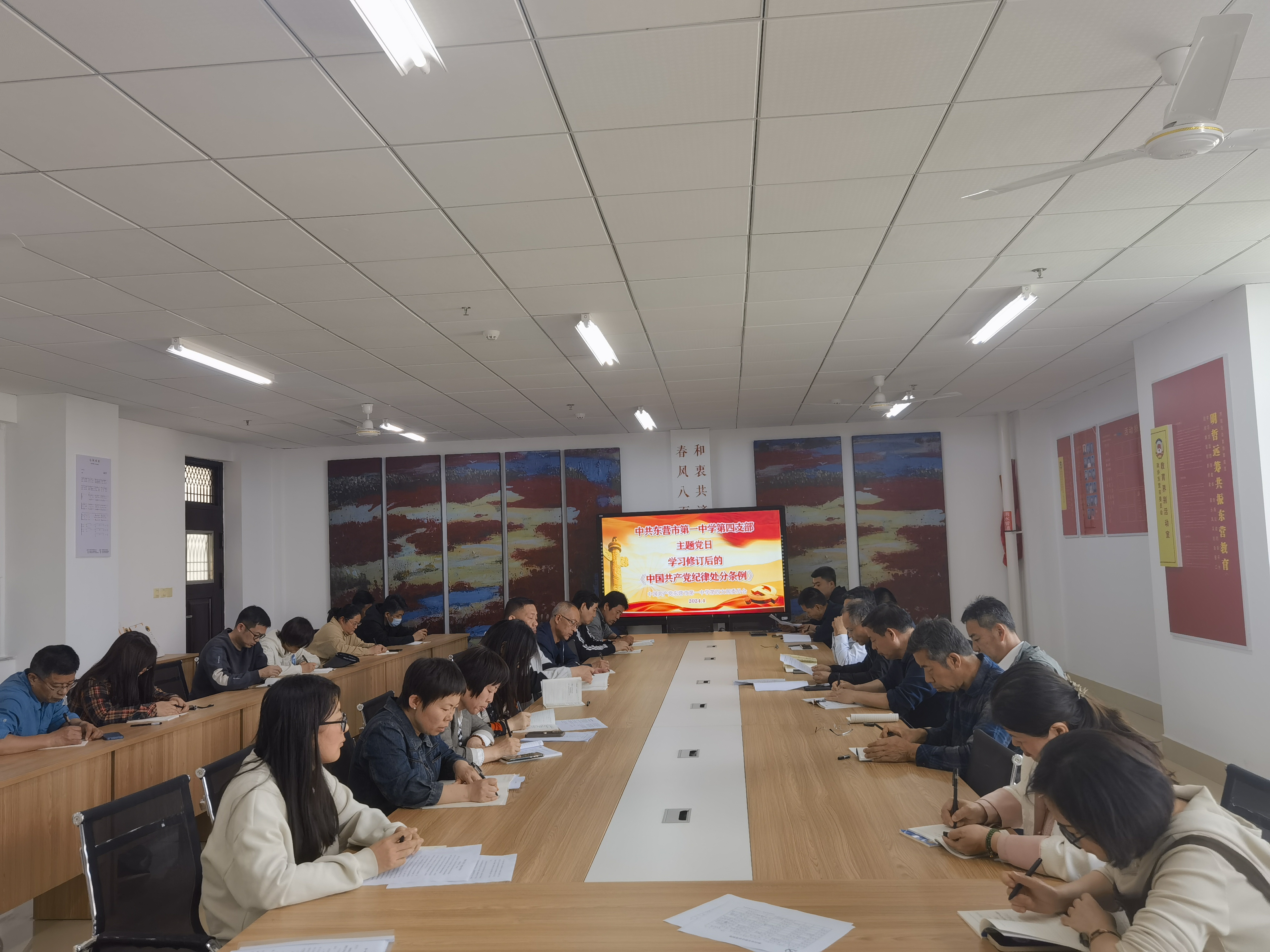 为进一步严格和规范党的基层组织生活,扎实做好党员经常性教育,4月19日,第四党支部组织全体党员教师开展了“学习修订后的《中国共产党纪律处分条例》”主题党日活动。会议由支部副书记巩欣锋同志主持,校党委成员刘培友副校长列席指导,全体党员参加。