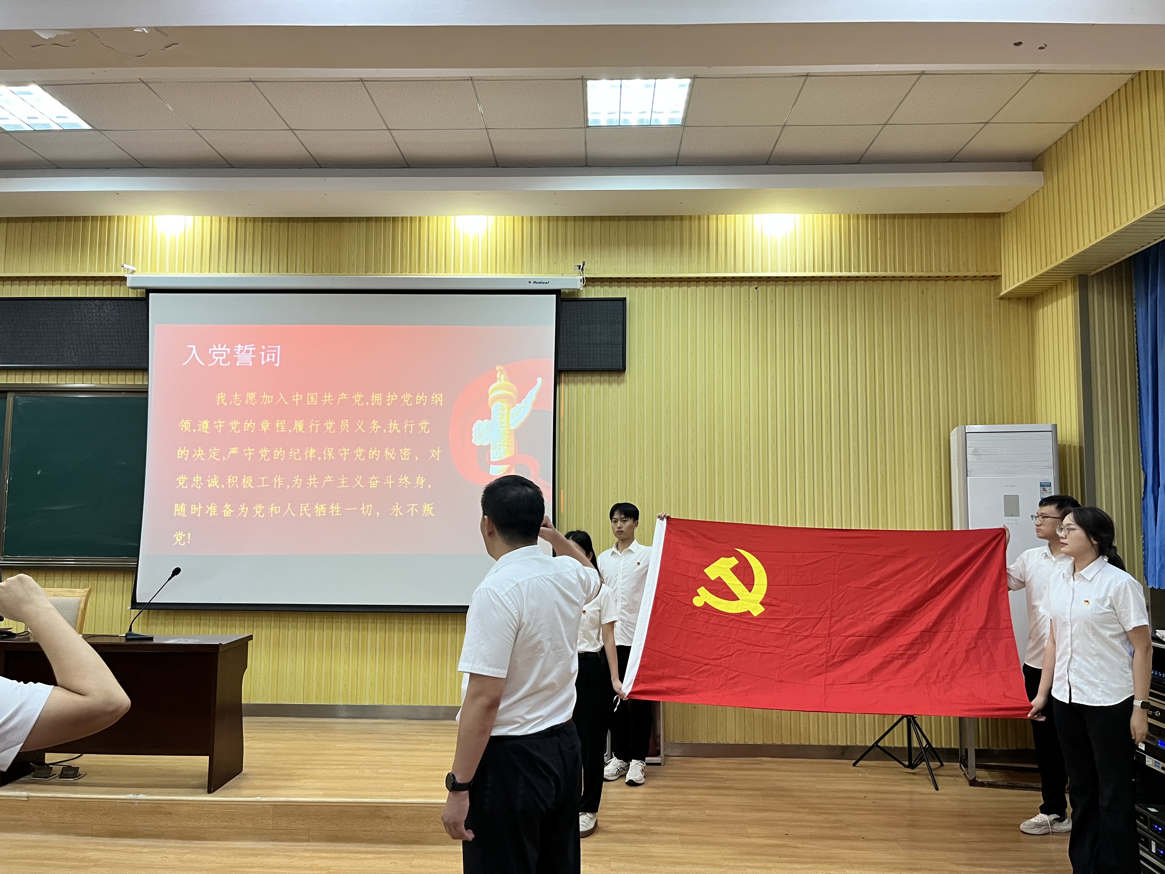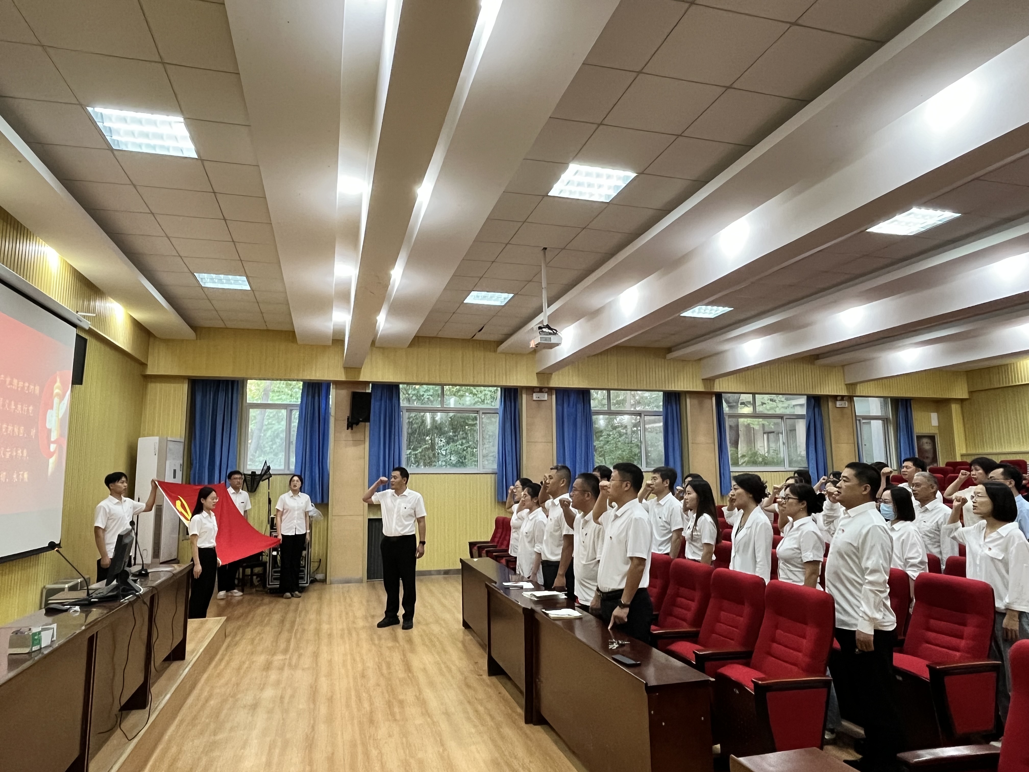 在支部书记姚继亮领誓下,全体党员紧握右拳,面向党旗,庄严宣誓,一句句誓言掷地有声,表达了大家为共产主义事业奋斗终身的决心和信心。庄严的仪式感,唤醒了我们每个人的党员意识。不忘初心、牢记使命,坚定不移跟党走,矢志不渝听党话,为实现伟大的中国梦贡献智慧与力量。