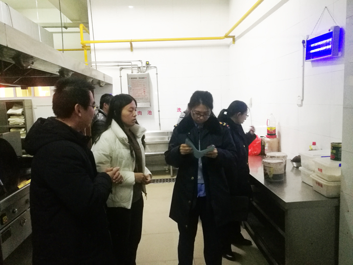 12月14日,区食药局来我校进行了季度食堂安全卫生检查。检查人员实地检查了各操作间卫生情况;操作间内保洁柜、盛器用具分类使用、清洗消毒情况;生产加工所用食用油、调料的生产日期、检验报告、供货商资质、进货台账的情况;职工健康证办理情况;各功能区标志、标识情况;库房、冷库各类原材料的储存登记情况;本次检查涵盖了“进货查验、台账登记、供货资质、产品检验报告、生产加工场所、生产加工过程、器具消毒、食品留样、从业人员健康”等食品安全管理的所有方面。