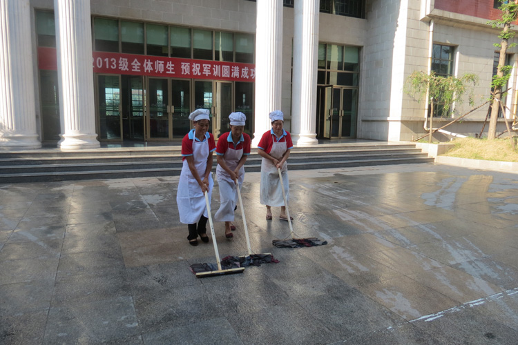 为了给军训就餐提供一个舒适的就餐环境,职工到位后,第一件重要的事情就是将餐厅里里外外,地面、墙面、门窗玻璃等进行彻底卫生扫除,不留死角。