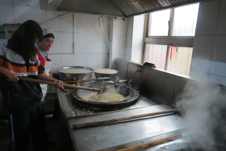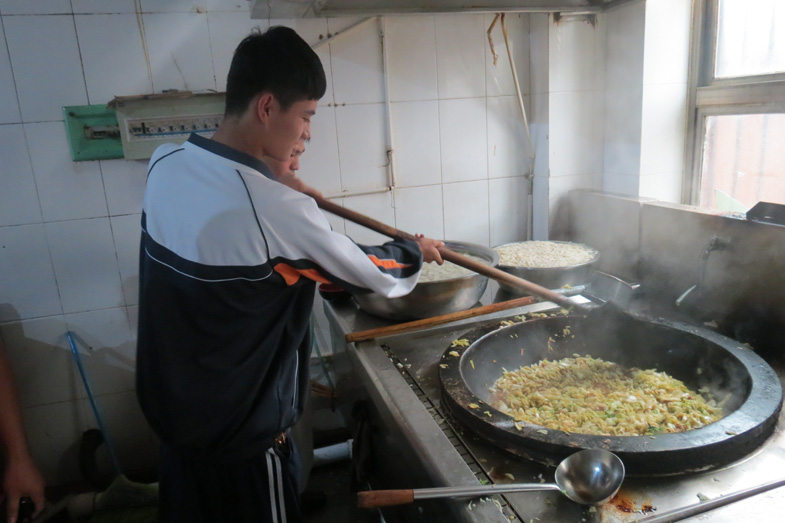 虽然食堂工作辛苦而且管理要求严格,但职工们乐于工作。“心态好,做出的饭自然也香”。这是一位阿姨给我说的。虽已进入金秋时节,但伙房里还是热气腾腾,温度在30度左右。职工们在此高温环境中,每天的工作时间达到10个小时。每次做完饭都是汗水浸透了衣服。但职工们能够像对待自己家人一样认真的做着自己岗位上的工作。