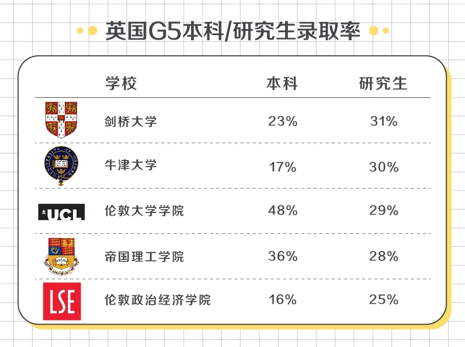 这是一份英国入学报告(Admission Report)统计的G5本科和研究生的录取率数。