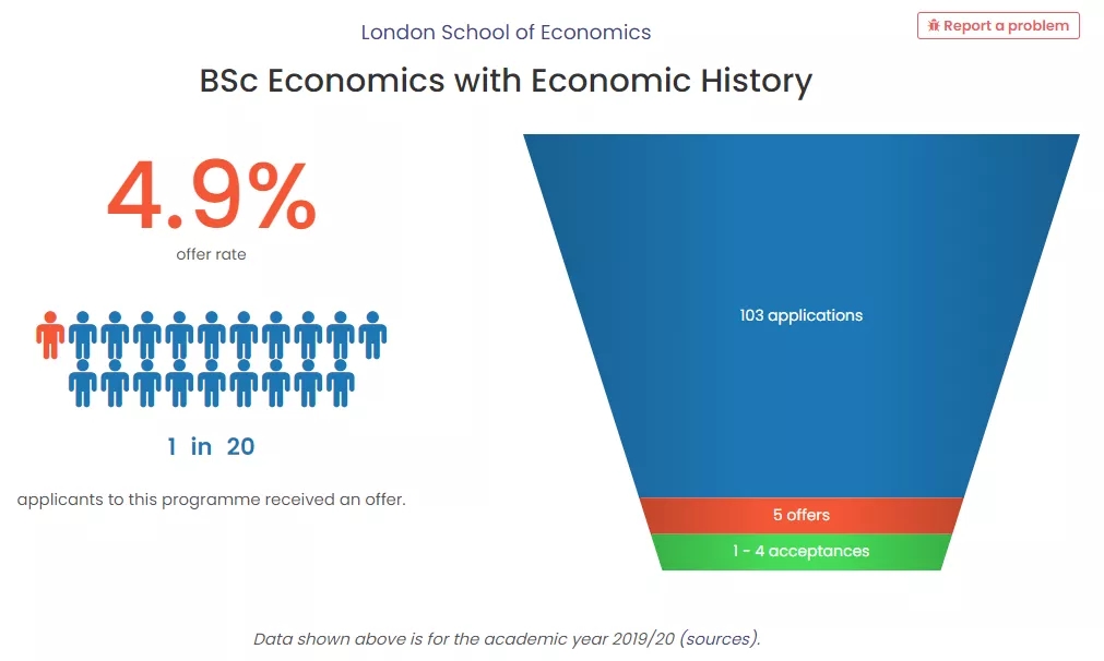 不仅如此,LSE的大热的经济学专业本科录取率只有4.9%(20个人才能进一个的概率,天选之子该有多秀)。