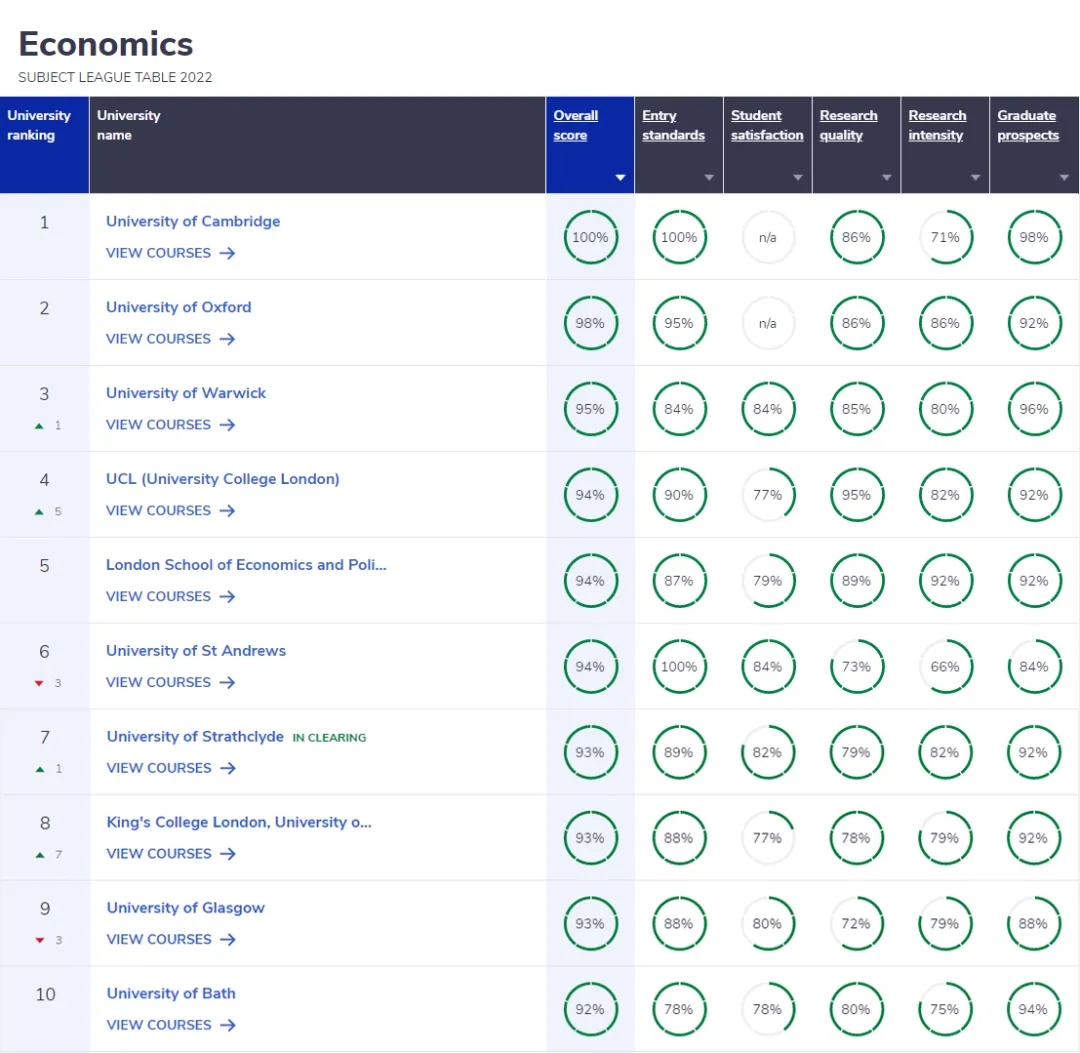 在《完全大学指南》2020英国大学经济学专业排名中,LSE虽然不是顶尖,但也排在了第五位,仅次于牛剑、华威和UCL。