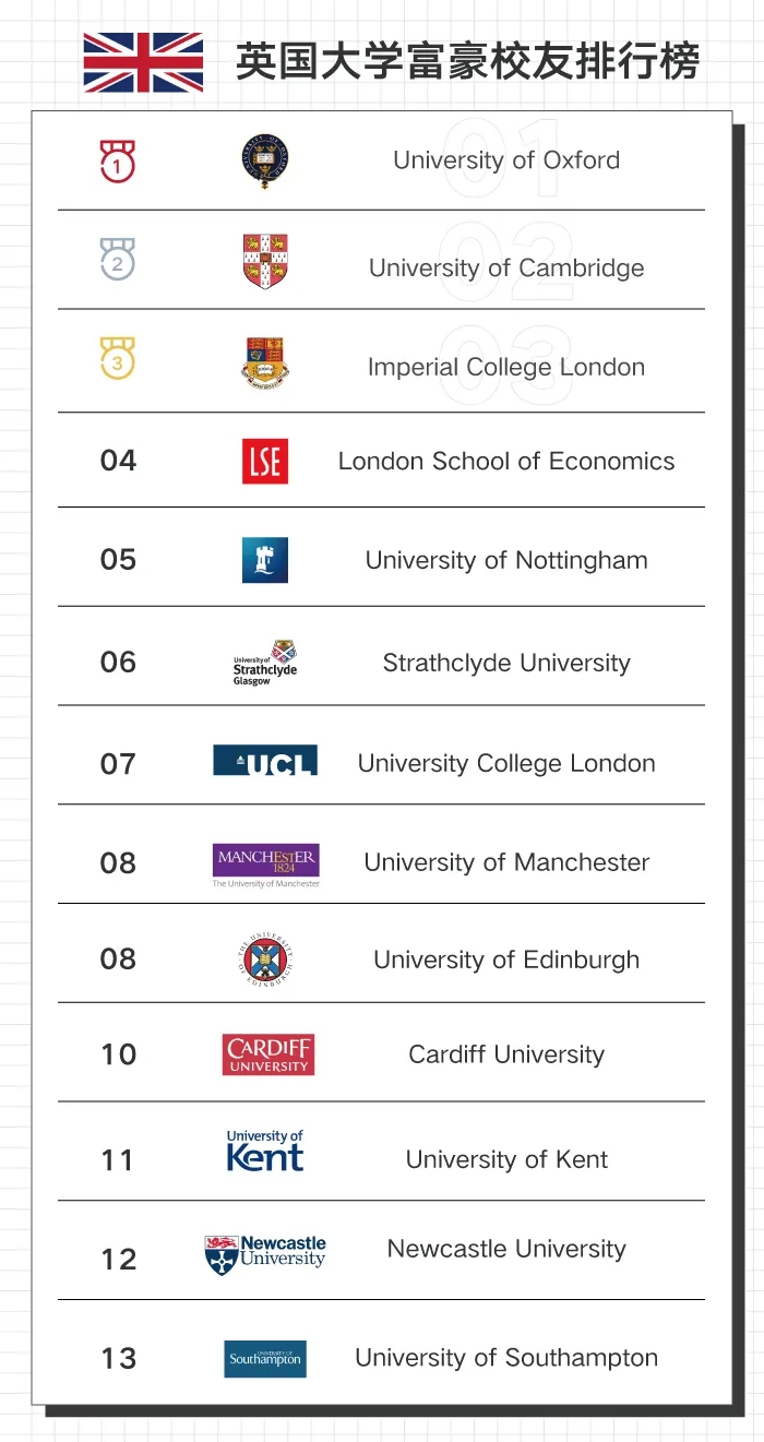 如果说上面两项排名,都是比较侧重于学术角度,那么这份《英国大学富豪校友排行榜》,就很直白坦荡了:去哪些院校,校友超级rich?