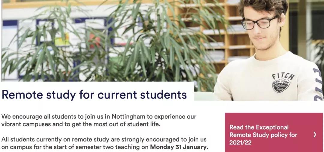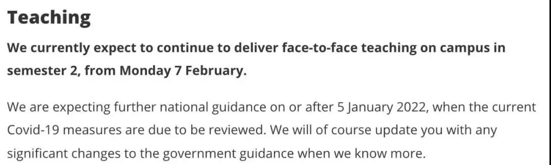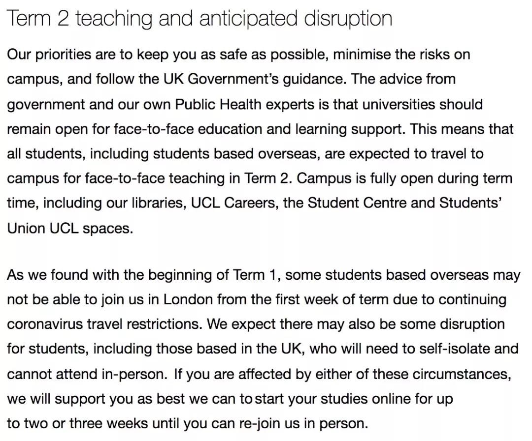学校表示,将为明年1月返校且预定了校内宿舍的国际学生提供自我隔离支持。如果国际学生由于特殊原因(仅限以下两点:国际旅行限制、健康或医疗状况不佳)无法在明年1月抵达英国,可以在明年1月10日之前填写网课申请表 (复制到浏览器中打开)