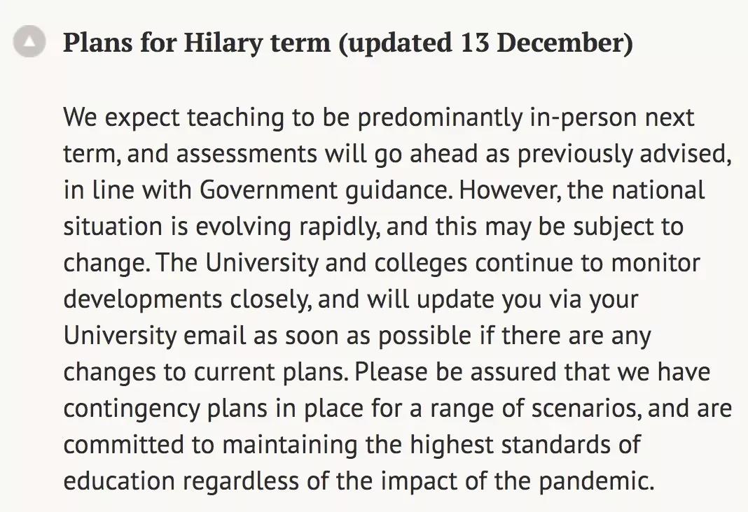 不过学校同时表示,因为英国疫情正在迅速变化,开学计划有可能会随之调整。如有调整,牛津大学将尽快通过电子邮件告诉大家。