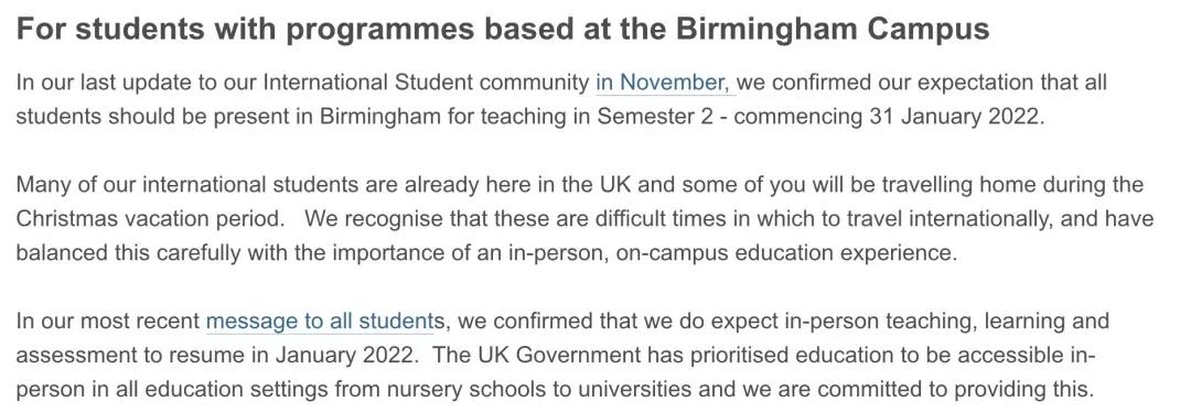 伯明翰大学计划让所有学生明年1月31日返校上课,考试也将恢复线下方式。