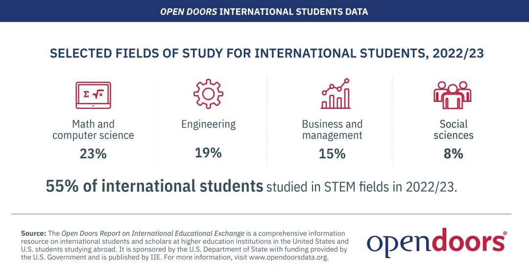 《2023年门户开放报告》(Open Doors 2023)显示,数学与计算机科学、工程学、工商管理、社会科学、物理与生命科学是中国学生赴美留学最热门的五个专业。