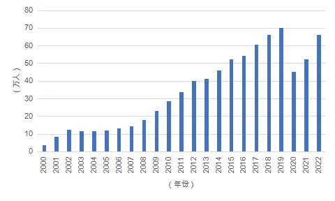 从2000年到2019年,尤其是在2008年北京奥运会后,中国的留学人数经历了快速增长,与中国参与全球化的趋势一致。