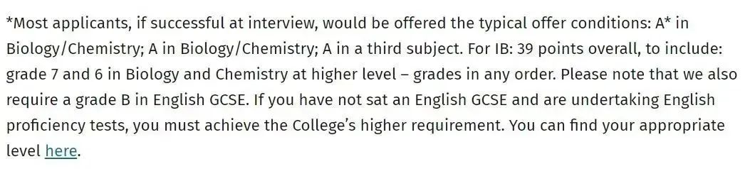帝国理工学院大多数专业没有明确GCSE/IG课程成绩。部分专业如医学会要求GCSE英语成绩达到B,在没有GCSE英语成绩的情况下,需要达到其他英语语言的Higher标准。