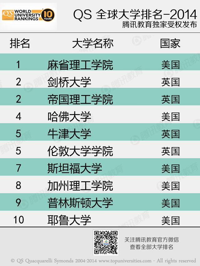 2014QS世界大学排名发布,英美高校依旧占领前十强。麻省理工学院蝉联第一,哈佛大学跌至第四,帝国理工学院挤入前三。就中国内地大学来看,27所大学进入QS榜单,清华大学(微博)第一次以排名47位登顶QS世界大学排名中中国大陆大学之首,它超过了未能进入前50的北京大学。
