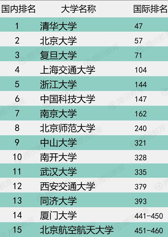 清华大学第一次以排名47位登顶QS世界大学排名中中国大陆大学之首。它超过了未能进入前50的北京大学(排名并列57位)。其原因部分归结于清华大学在研究影响指标“单位教职引用率”上的提高,在清华大学在此项上升了36位的同时,北京大学下跌了18位。