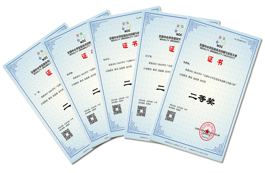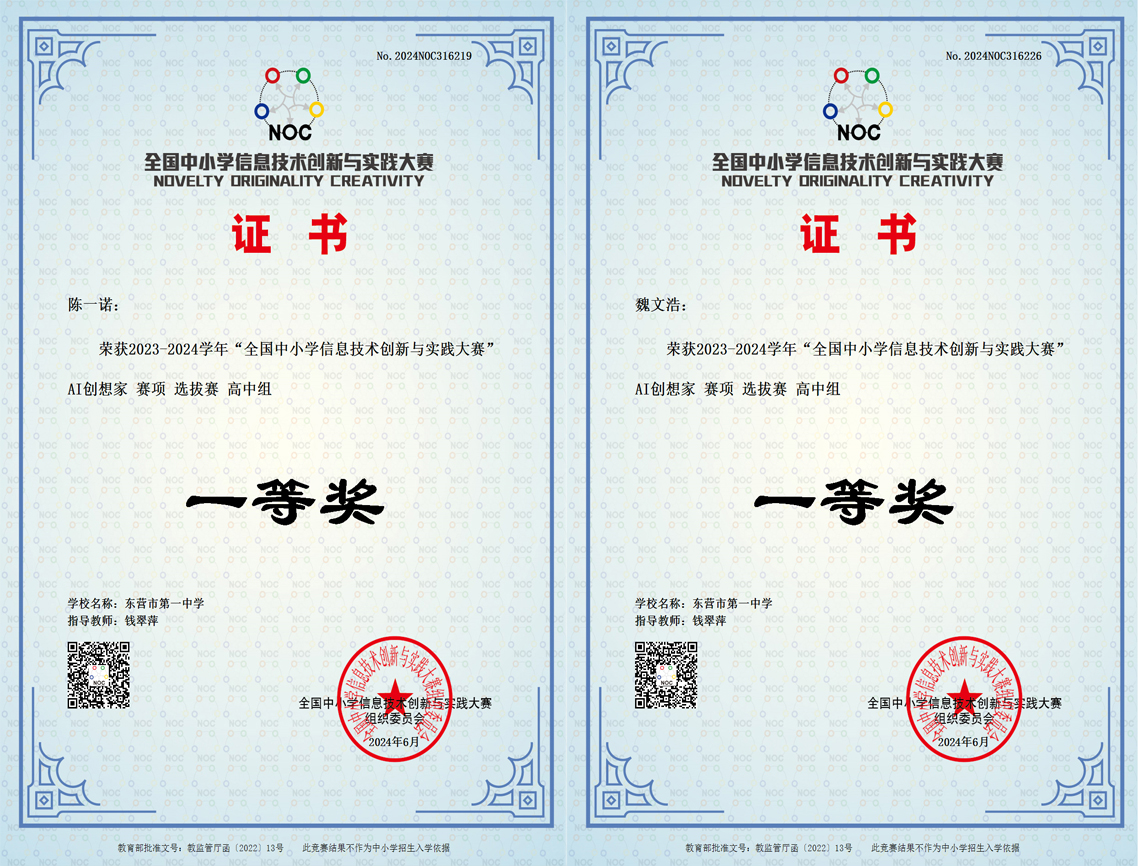 近日,我校电教处钱翠萍、毕玲玉老师组织学生进行线上培训并参加的2023-2024学年“全国中小学信息技术创新与实践大赛”AI创想家赛项全国选拨赛成绩揭晓,我校陈一诺、魏文浩同学荣获一等奖,入围参加7月中旬全国总决赛,杜沛东、王一诺、孙绍涵等5位同学荣获二等奖,张志玲、孙诚泽、周世豪等16位同学荣获三等奖,恭喜获奖的同学们!