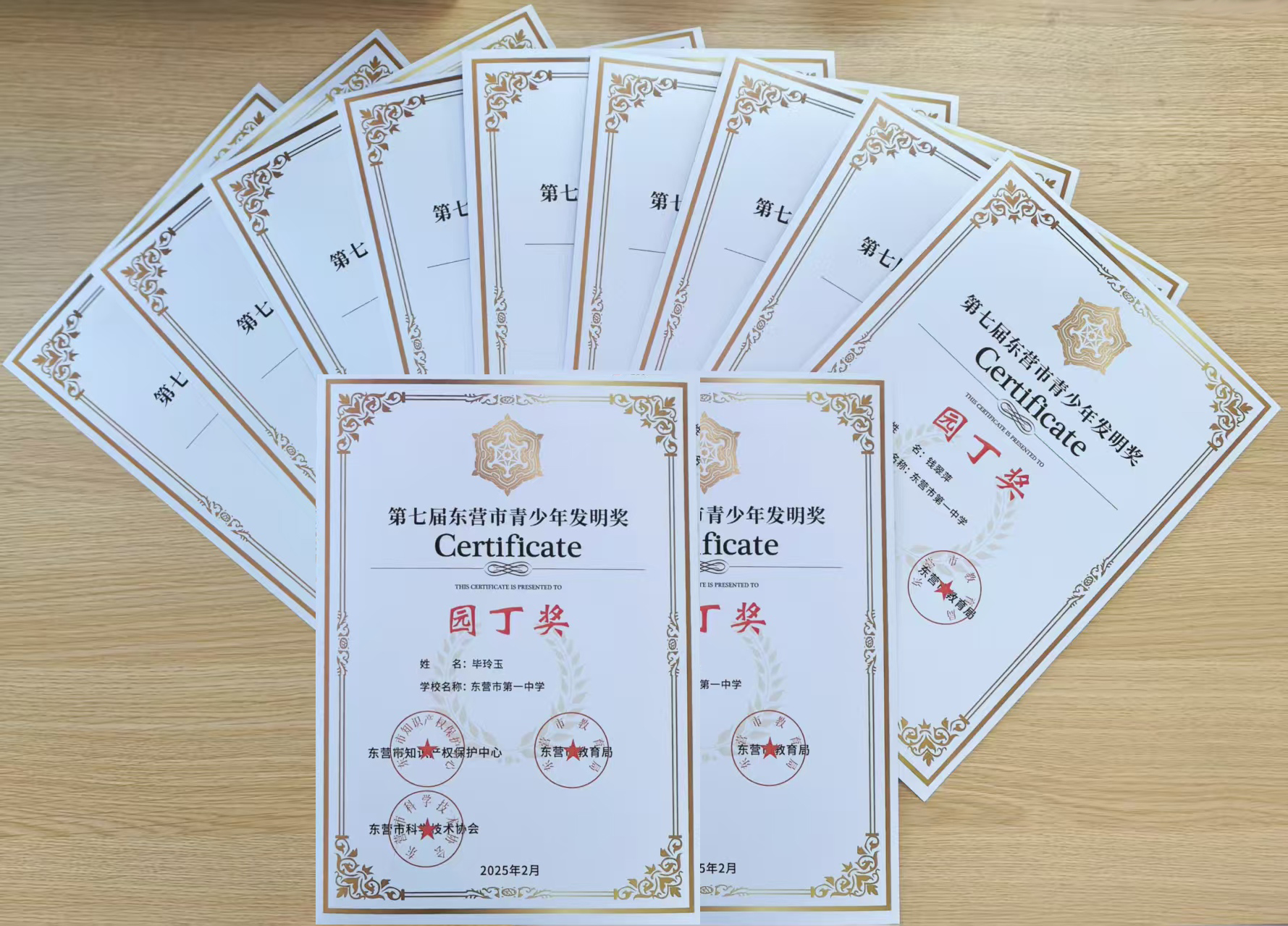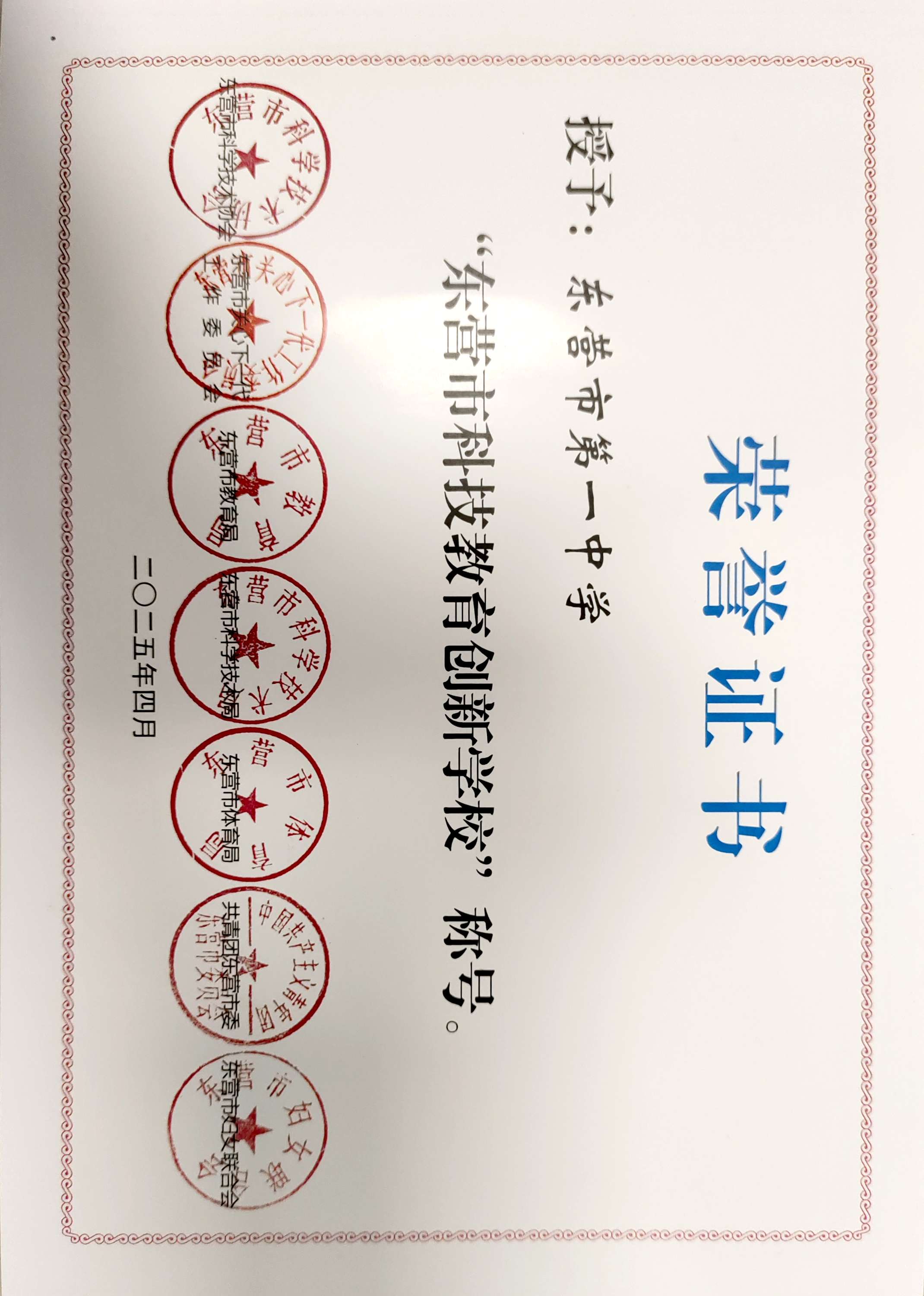 在第七届“东营市青少年发明奖”评选活动中,我校喜获“东营市科技发明教育基地”称号!钱翠萍、毕玲玉、李文晓、张喜燕、马志鸿、苏现朕、王强、周荣伟、唐俊星、赵欣、张瑞等11位老师荣获市“园丁奖”,高一睿等11位同学荣获市一等奖,孙臣桐等5位位同学荣获市二等奖,刘森瑞等5位同学荣获市三等奖,获奖人数与等次均创新高。
