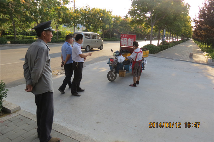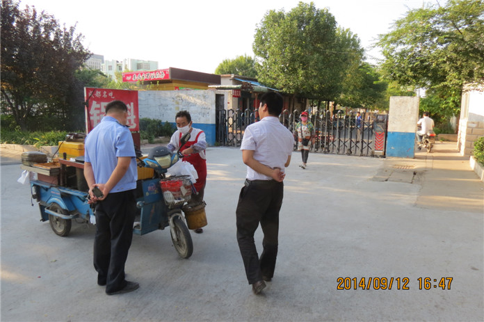 9月12日下午,城市管理局王队长和张警官到学校走访了解校园周边环境存在问题。针对近期学校门口小摊点卖饭人员反弹的情况,王队长对已到现场的商贩进行了劝解和交流,敦促共同维护环境,不要在校园周边摆摊。对中午和下午放学重点时段采取严格措施,加强检查管理。建议学校在校外治理同时时,加强对学生的教育,共同维护好环境秩序。