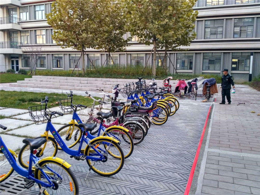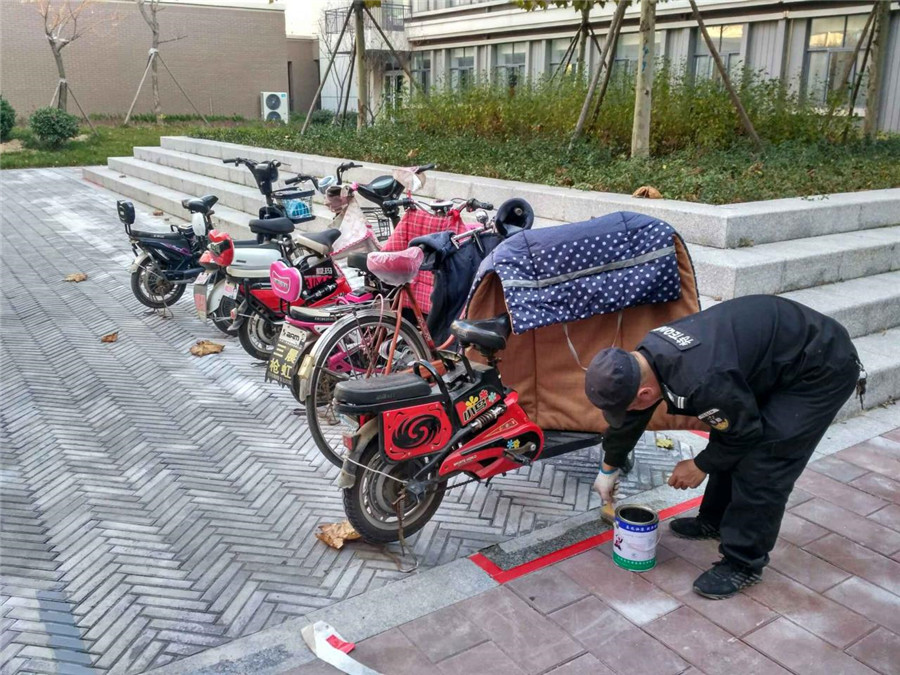 安保处组织对共享单车停车区重新划线