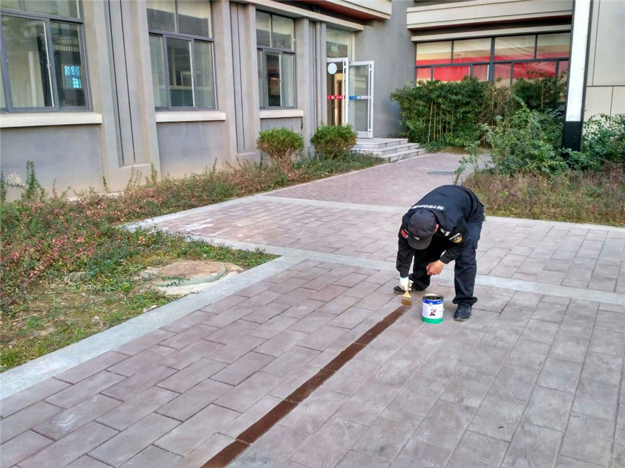 由于大理石地面表面粗糙,几周前安保处用红色自粘胶带黏贴的共享单车停车区部分胶带已经脱落。经过研究,我们暂时决定用磁漆当介质,作为胶带和地面的粘合介质,油漆干透后再将胶带补上。
